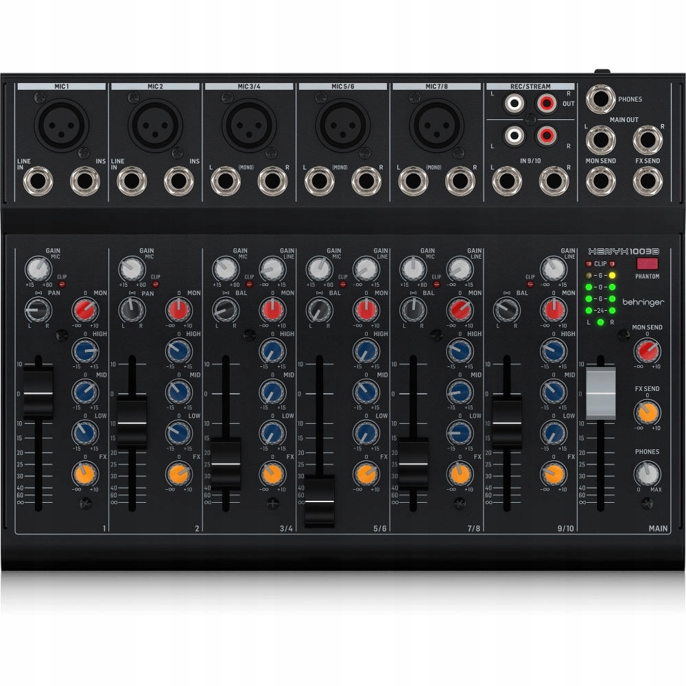 Кожен канал Приймач 1003B оснащений окремим 60 мм глушником, оснащеним точним контролем над цим каналом. 3-смуговий канальний еквалайзер дозволяє використовувати та музично формувати звук для альтернативного виходу. Вбудований постфейдерний контроль надсилання ефектів для кожного каналу дозволяє отримати додатковий вихід FX, надаючи вам більше. Моніторна шина підсумовує канали перед фейдером і еквалайзером, щоб створити незалежний моніторний мікс.