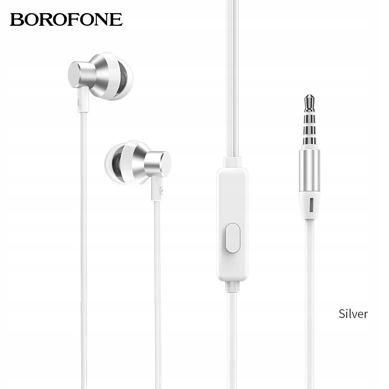 BOROFONE BM35 Farsighted — кабельні аудінавушники з роз’ємом 3,5 мм AUX Jack, оснащені мікрофон, за допомогою якого можна телефонувати, кнопка для керування музикою чи дзвінками та металевий корпус.