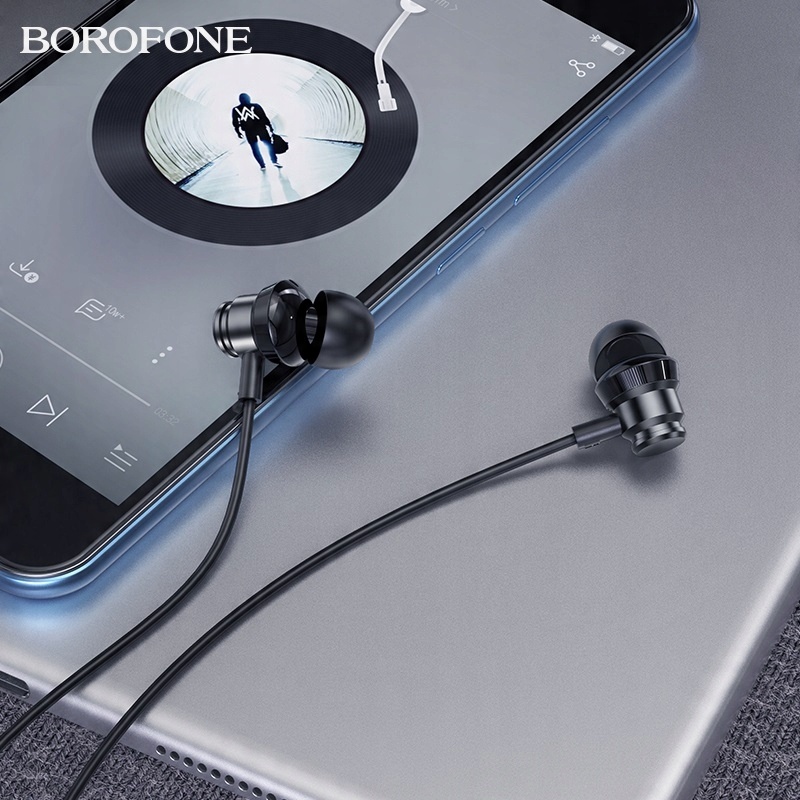 BOROFONE BM62 Prosperity - кабельні аудіонавушники з роз'ємом 3,5 мм AUX Jack, оснащені мікрофон, за допомогою якого можна телефонувати, кнопка для керування музикою чи дзвінками та металевий корпус.
