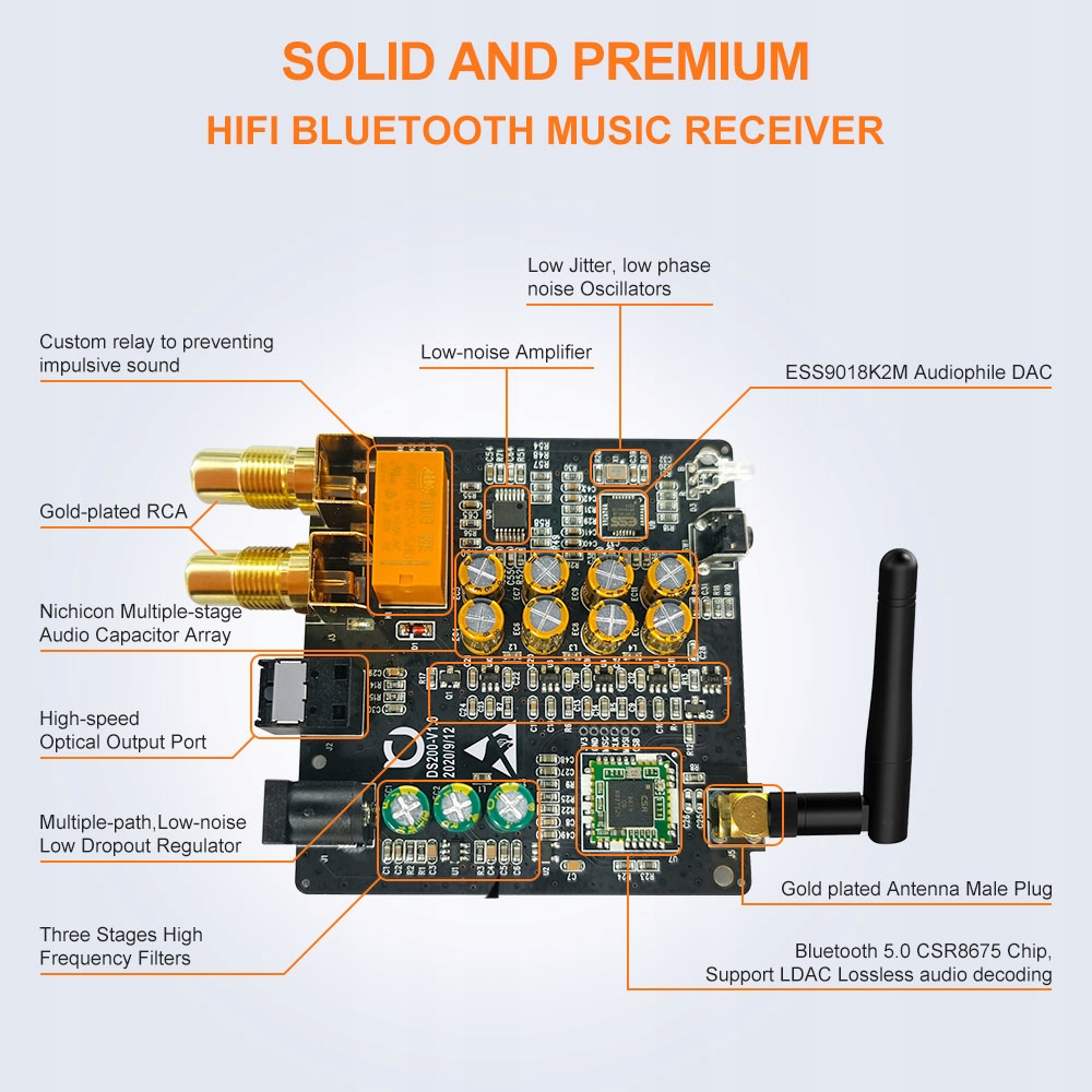 Приймач Bluetooth DS200 Pro для домашньої стереосистеми оснащений Bluetooth 5.0 (CSR8675), який є першокласним рішенням для високоякісного бездротового аудіо та підтримує декодування aptX, aptX LL, aptX HD, AAC.