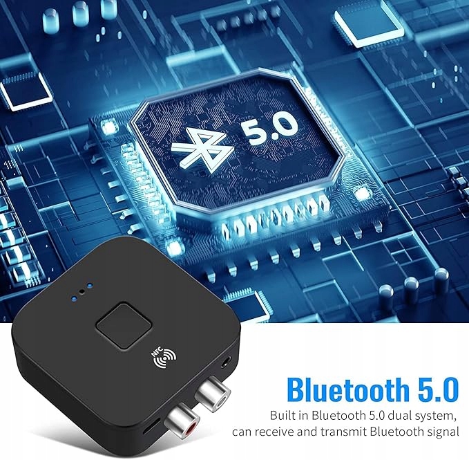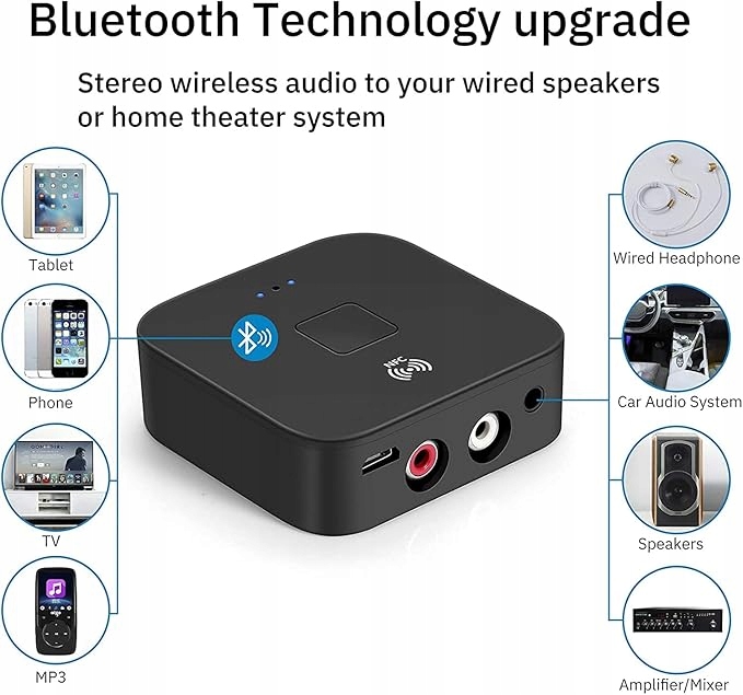 Сучасний аудіоприймач Bluetooth 5.0 із підтримкою NFC забезпечує бездротову передачу аудіо на старіші аудіопристрої, оснащені входом AUX (3,5 мм) або RCA. Завдяки цьому ви можете легко перетворити свій підсилювач, автомобільне радіо, дротові навушники чи домашню аудіосистему в обладнання, яке підтримує сучасну бездротову передачу.