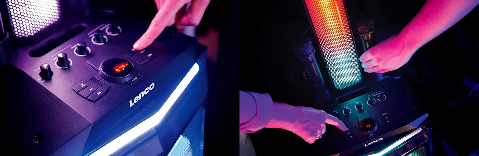 Lenco PA-220 — колонка для вечірок з переднім підсвічуванням і додатковою (знімною) опорою, яку можна розмістити на колонці. Потужний підсилювач класу D з режимом X-drive має вихідну потужність 120 Вт RMS. Він складається з одного рупорного динаміка, двох 3-дюймових НЧ-динаміків і 10-дюймового сабвуфера. Ви можете підключити свій смартфон або планшет через Bluetooth® і відтворювати музику безпосередньо з улюбленої програми.