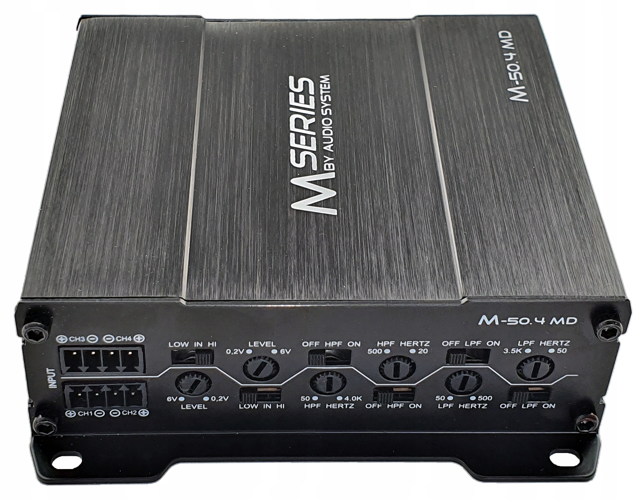 4-канальний цифровий підсилювач високої потужності з SMD технологія перемикається Дозвуковий, HP , LP, BP фільтр і повний активний режим можливий, виявлення високого рівня вхідного сигналу або сигналу з автоматичним "ВКЛЮЧЕННЯМ", 4x 50(100) WRMS при 4(2) Ом, 113x38x100 мм