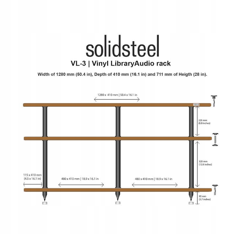 Усі матеріали ретельно виготовлені, відібрані та мають італійське походження. Рама складається з деталей нашої знаменитої серії S, усі її гвинти оцинковані, стійки рами виготовлені з анодованого алюмінію, ретельно заповнені абсорбуючою губкою для гасіння коливань. Різні металеві компоненти, такі як нижній і верхній кінці, усі оцинковані та покриті порошковою фарбою, щоб уникнути ризику іржавіння з часом. Серія VL складається з полиць із МДФ розміром 1280x410 мм, товщиною 22 мм, оздоблених високоякісним полімерним ламінатом кольору горіх. Відповідно до концепції меблів, перша нижня полиця призначена для розміщення вінілових колекцій, а наступні полиці пропонують відстані, призначені для розміщення вашої власної аудіосистеми, хоча це рішення, рекомендоване нами, як модульний продукт, все це можна вільно замінити.