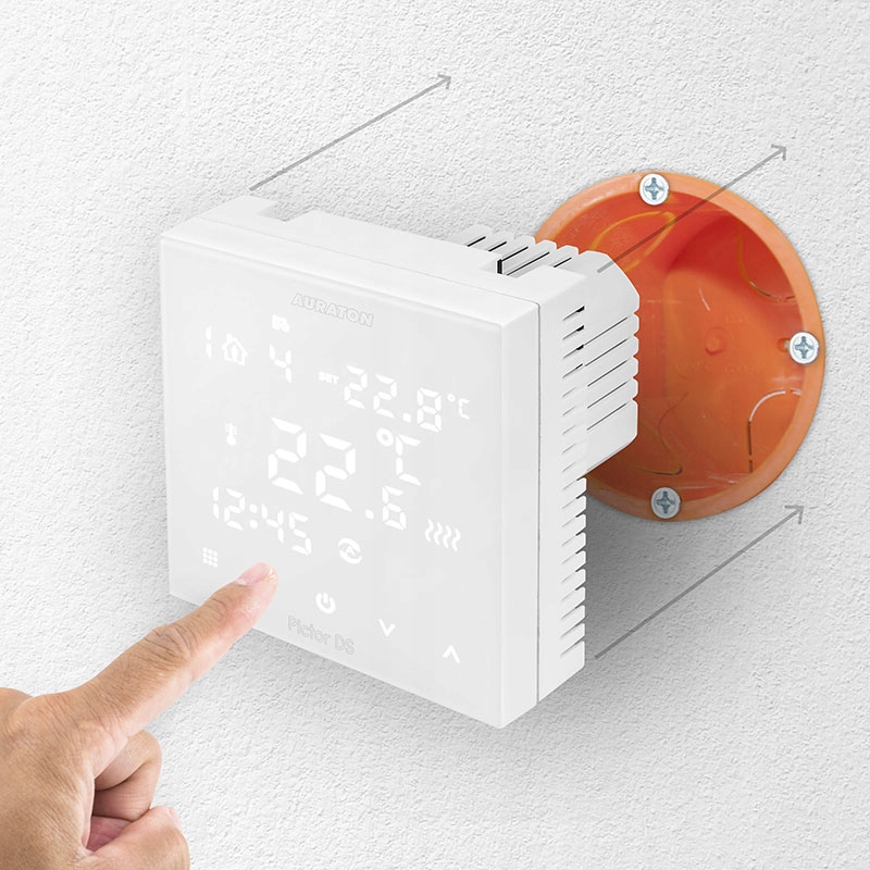 Auraton Pictor DS - це прихований електронний регулятор із сучасною сенсорною панеллю, що дає можливість встановити температуру з хвилинною точністю. Він працює з нагрівальним пристроєм, наприклад За допомогою газу, електричним котлом, а також килимками, фольгами та нагрівальним кабелям, а також електричними обігрівачами. Користувач може керувати 6 температурними програмами на день, розташованих у 3 тижневі графіки. Крім того, він має можливість встановлювати незалежну відпустку та ручну температуру.