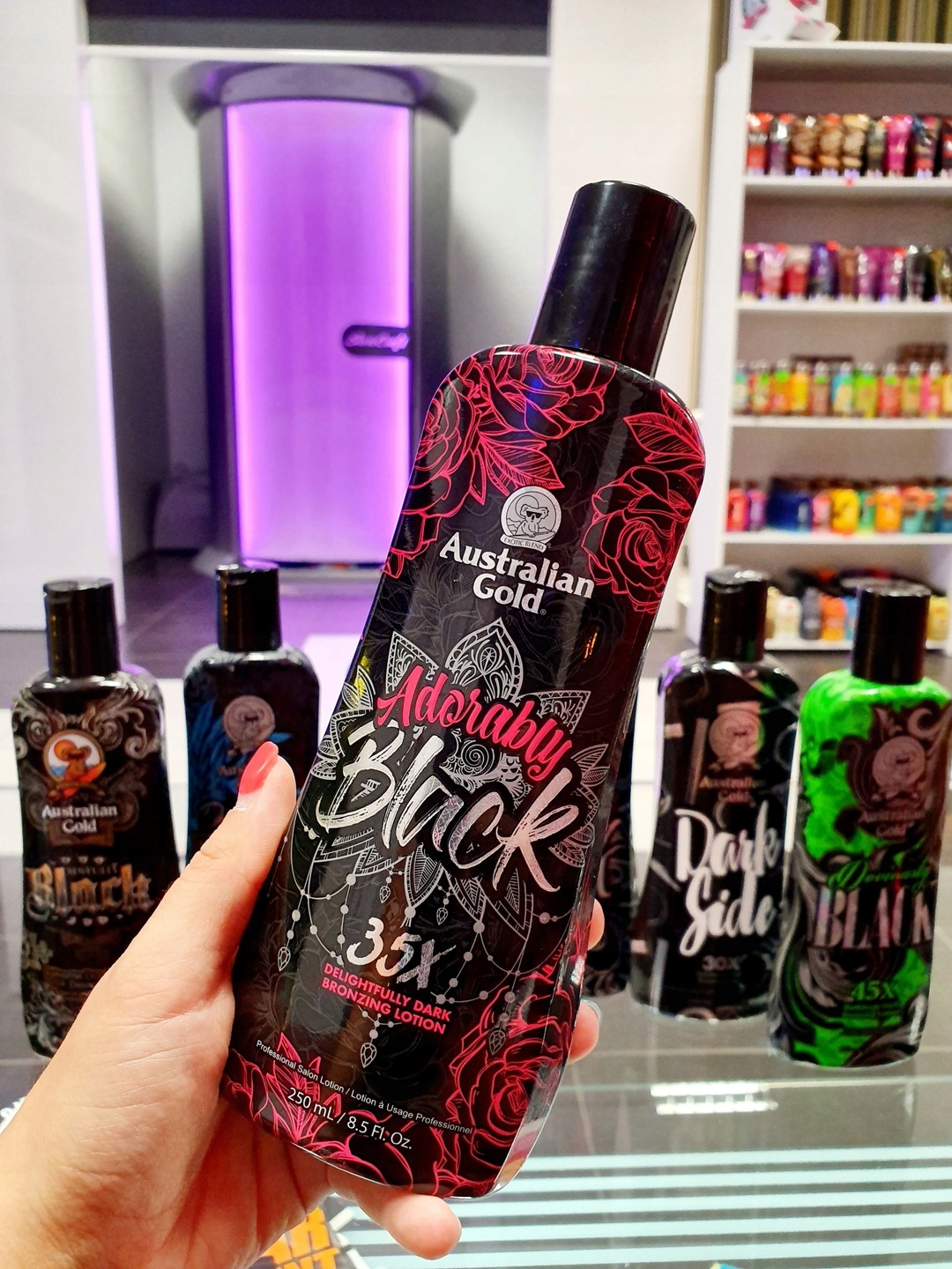 Australian Gold Adorably Black у чарівній та спокусливій упаковці — це ідеальне поєднання натуральних бронзаторів і високоякісної DHA.