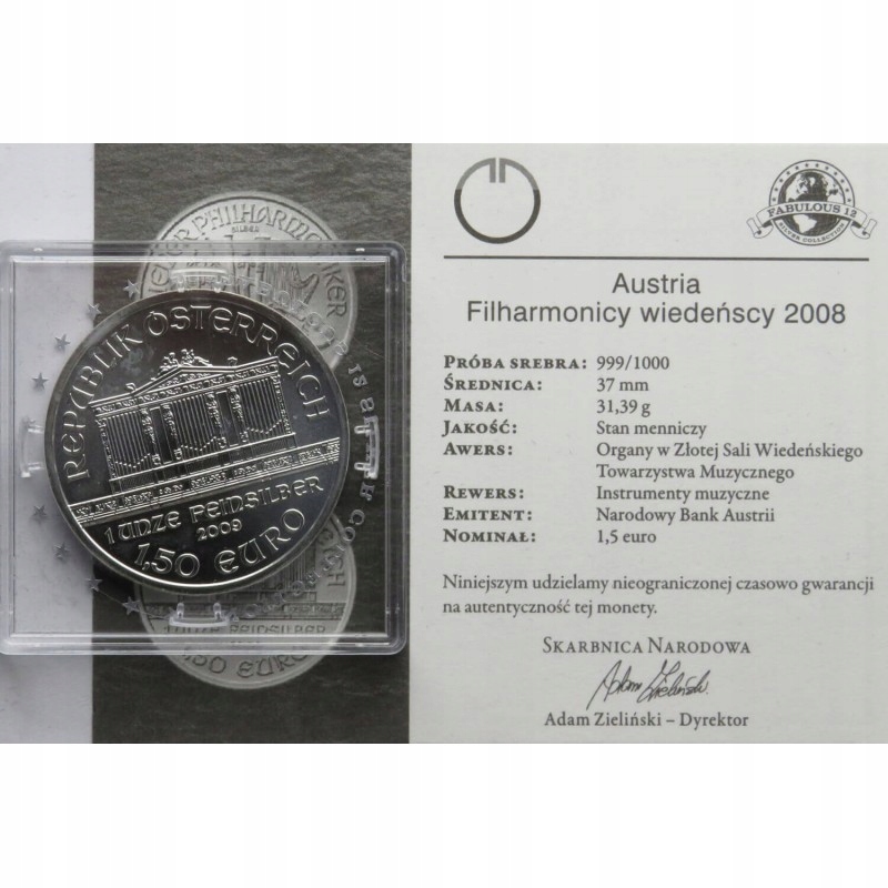 Austria 1,5 Euro 2008 Filharmonicy wiedeńscy, srebro, 1oz, stan 1
