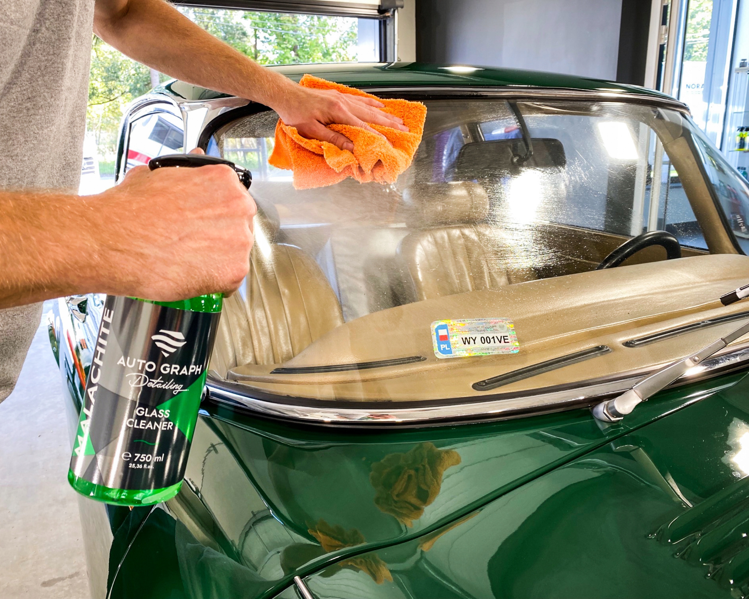 Почніть з обережного розбризкування чистої тканини з мікрофібри Auto Graph Malachite — пам’ятайте, нанесіть її безпосередньо на мікрофібру, а не на скло.