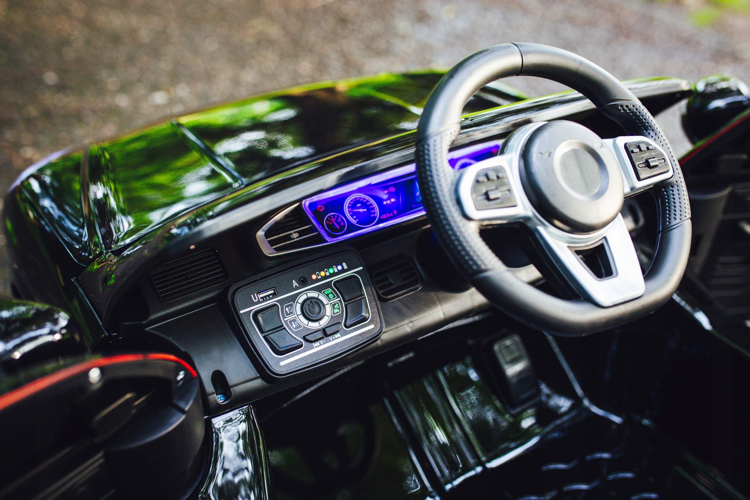 Автомобіль оснащенийзвуком керма - звук клаксона, запуск двигуна та ін. мелодії. Додаткова музична панель дозволяє підключати нашу улюблену музику через порт USB/AUX. Автомобіль має світлодіодні ліхтарі, а також індикатор рівня заряду акумулятора та годинники з підсвічуванням.