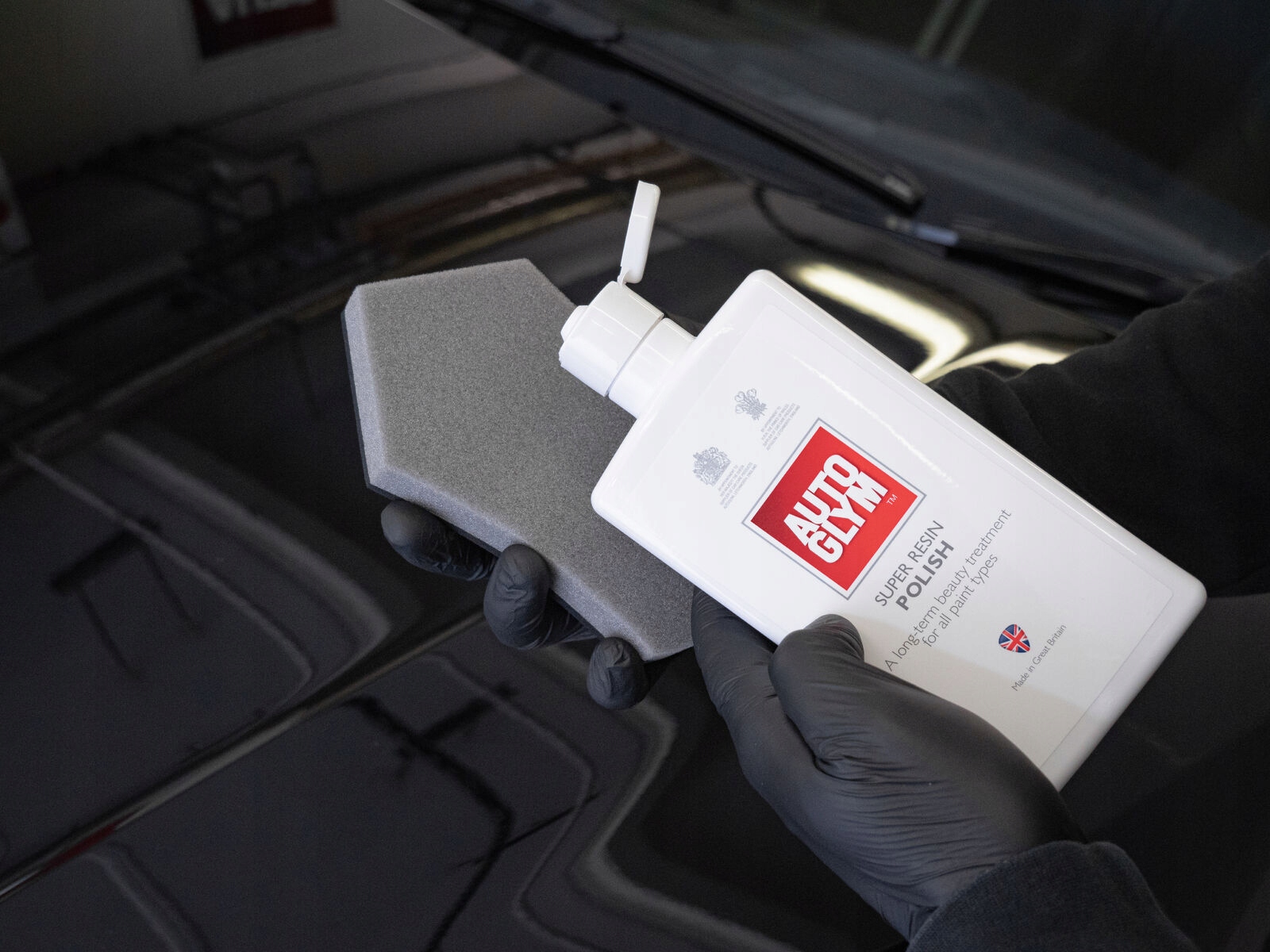 A: Super Resin Polish підходить лише для пофарбованого кузова. Якщо залишки Super Resin Polish потрапили на непофарбовану поверхню, видаліть їх за допомогою Autoglym Fast Glass with Hi-Tech Microfibre.