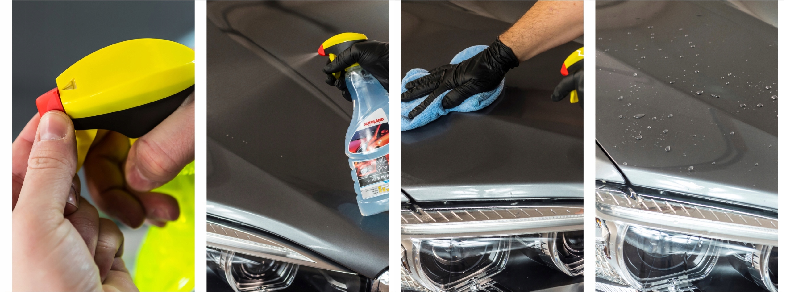 Швидка деталізація – надає фарбі автомобіля блиск, глибину кольору та гладкість. Дуже простий у використанні, просто «розпиліть і відполіруйте», щоб відновити блиск фарби вашого автомобіля. Він залишає стійке до атмосферних впливів гідрофобне покриття, яке полегшує протікання води та запобігає прилипанню бруду. Його також можна використовувати на попередньо нанесених покриттях як доповнення.
