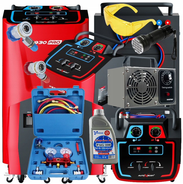 СТО КОНДИЦІОНА AUTOSCAN X930PRO R134a або R1234yf ПОЛЬСЬКА МОВА та ОЗОНАТОР, МАНОМЕТР ДЛЯ ПЕРЕВІРКИ НА ГЕРМЕТІЧНІСТЬ, ЛАМПА З УФ СКЕЛКАМИ, МАСЛО.