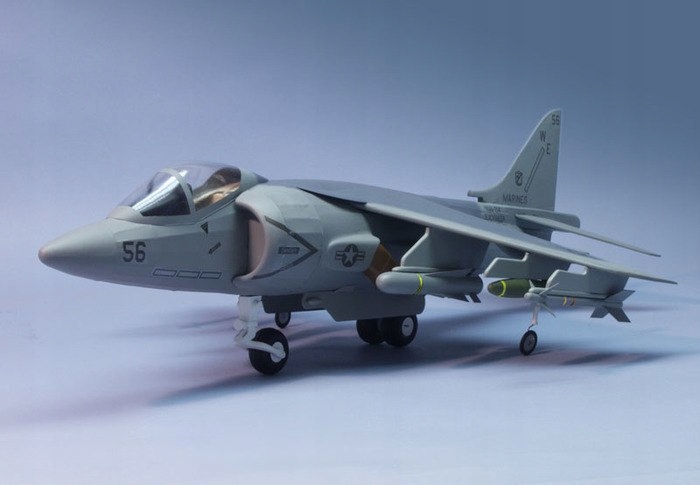 Модель літака AV-8B Harrier виробництва американської компанії Dumas. Відмінна модель літака для початківців, яких здивує легкість конструкції, але також підійде для більш досвідчених конструкторів, які будуть оцініть якість матеріалів і точність вирізаних лазером елементів. Модель американської компанії Dumas.Характеристики: