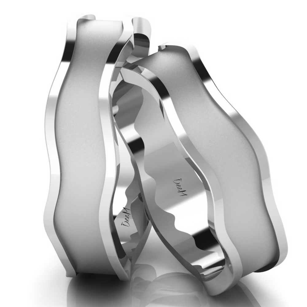 дизайнерські обручки з унікальною, нерегулярною формою. Краї весільних кілець потовщені і мають відшліфовану обробку, а стрічка всередині була матована. Зроблено з 14-каратного білого золота. Це ідеальна модель для людей, які цінують сучасність, мінімалізм та цікавий дизайн. Унікальний та унікальний набір, який підкреслить ваш індивідуалізм.