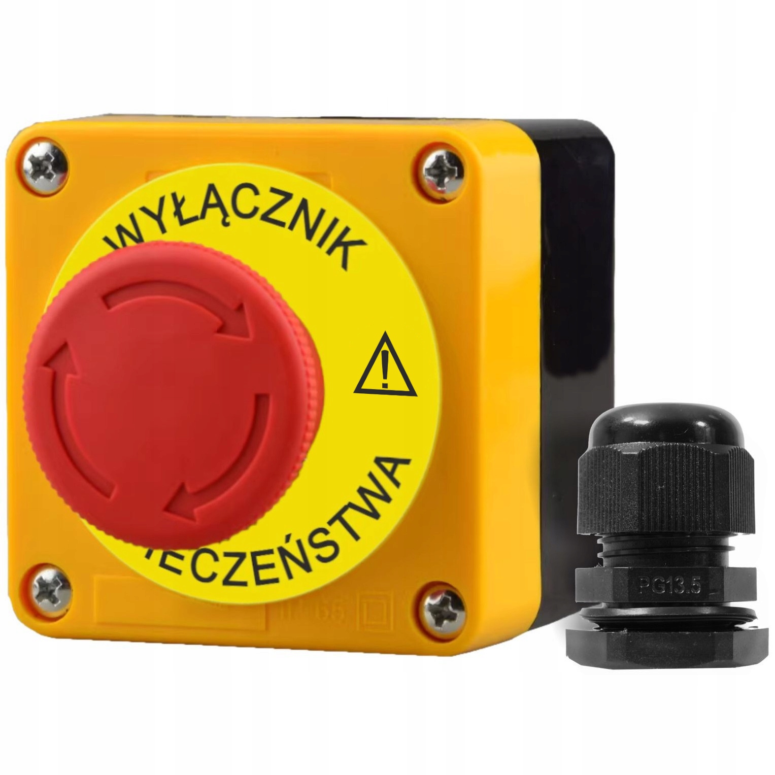 ✅ Касета управління жовта, з червоною аварійною кнопкою - СТОП - грибовидна, долонькова, з дроселем PG 13,5, пластиковою табличкою попередження, в герметичному корпусі.