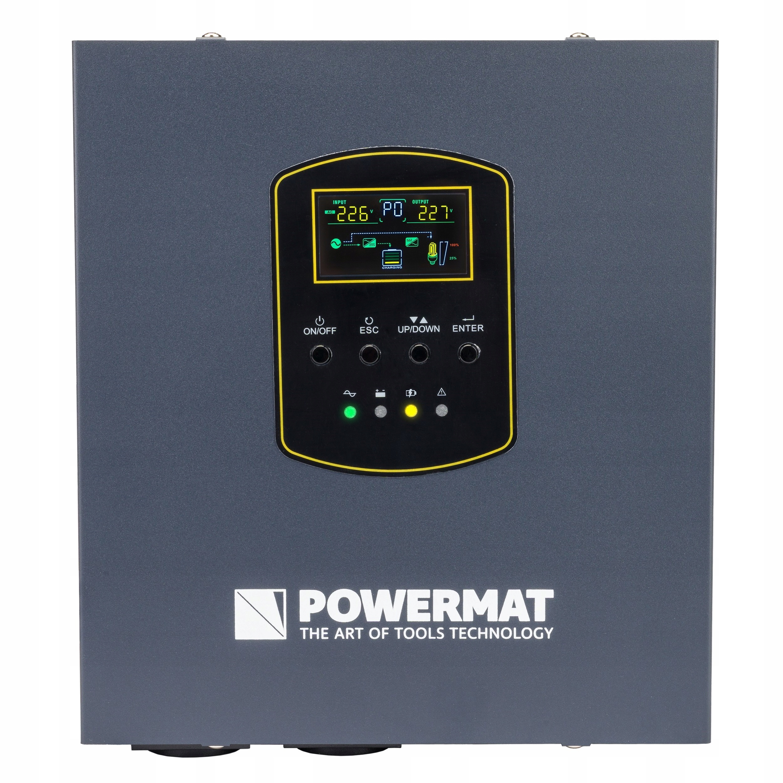 Завдяки РК-дисплею користувач може контролювати основні параметри живлення живлення, наприклад: вхідна та вихідна напруга, частота в Гц, стан батареї, навантаження та поточний режим роботи. Це забезпечує безперервне уявлення про стан пристрою та дозволяє швидко реагувати в разі потреби.