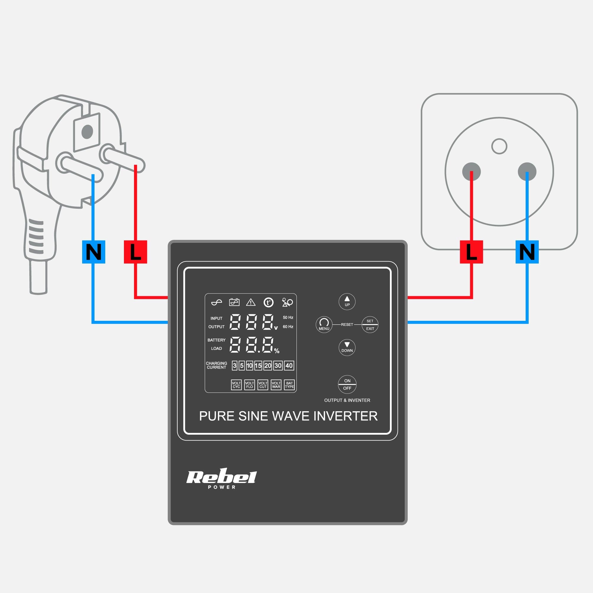 Комфортне використання джерела безперебійного живлення Rebel гарантується чітким світлодіодним дисплеєм. Завдяки цьому ви можете легко прочитати поточний робочий стан пристрою, перевірити, серед іншого: вхідну напругу, вихідну напругу та частоту. Крім того, ви можете швидко перевірити рівень навантаження та рівень заряду батареї.