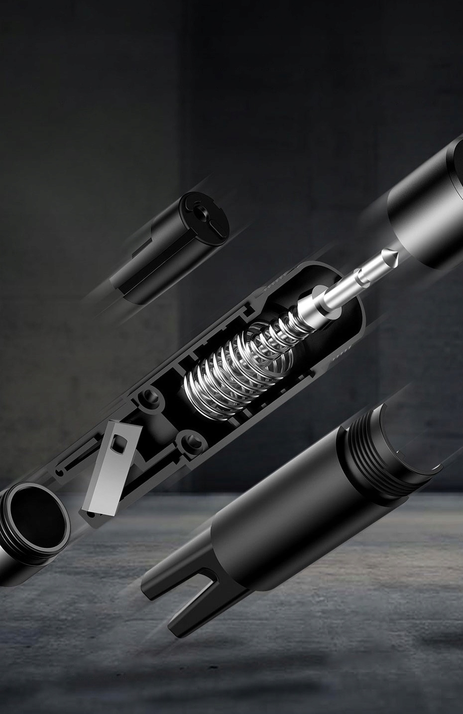 У пристрої встановлена пружина для збільшення сили удару, яка також використовується у зброї, тож навіть дитина може розбити скло.