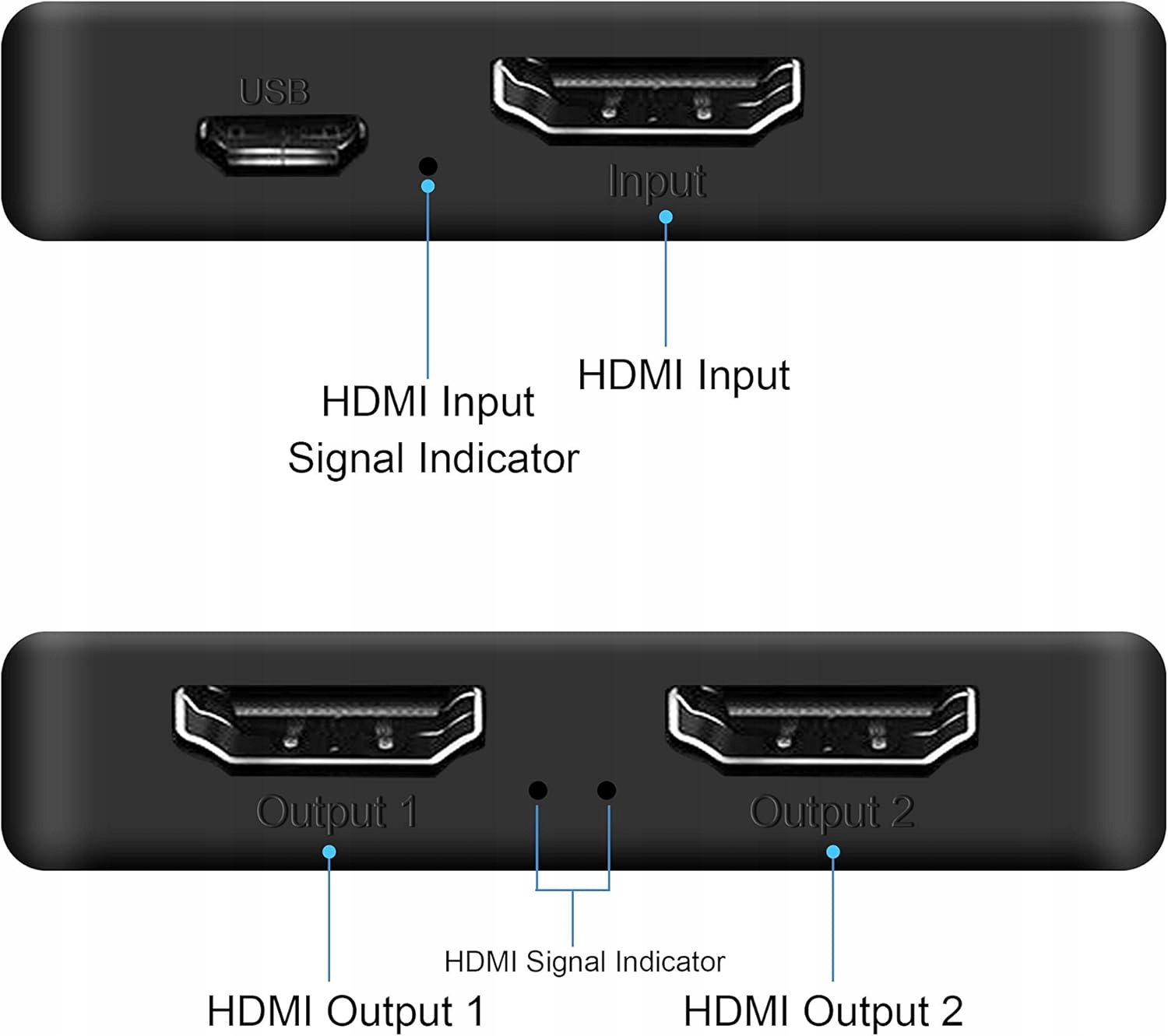 1 x 2 розгалужувач HDMI підтримує Ultra HD 4Kx2K @60Hz RGB 4:4:4, HDCP 2.2, HDMI2.0b, HDR, 1080P @120Hz Підтримка Deep Color 30 біт, 36 біт, максимальна пропускна здатність 18,5 Гбіт/с, сумісний з 1080i/720P/576P/576i/480P.