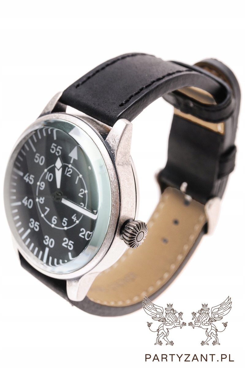 Створено за зразком RLM - Reichs Luftfahrt Ministerium. Годинник заводського віку. Масивний корпус з авіаційного алюмінію, дуже міцний. Стійкий до ударів і погоди. Годинник водонепроникний до 30 м. Товсте лінзоподібне скло дозволяє читати під великим кутом. Стійке до подряпин мінеральне скло. У зв'язку зі специфікою завдань екіпажів винищувачів і бомбардувальників основною шкалою є секундна шкала - секундомір. Чітка, менша годинна шкала. Стрілка, що вказує 12 годин, полегшує навігацію та орієнтування в повітрі. Флуоресцентне маркування дозволяє читати в темряві. Суцільний пояс з щільної волової шкіри. Незважаючи на свою товщину, він дуже м'який і гарантує високий комфорт при носінні. Ремінець регулюється за допомогою пряжки. Годинник упакований в ексклюзивну коробку з наповненням, ідеально підходить на подарунок.