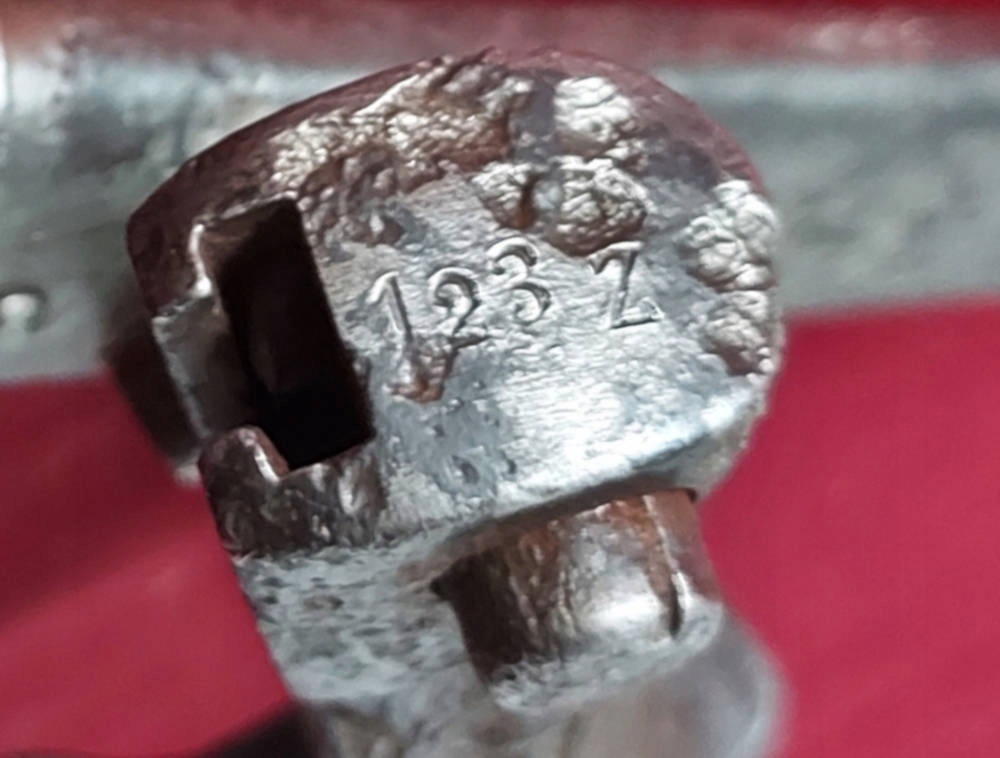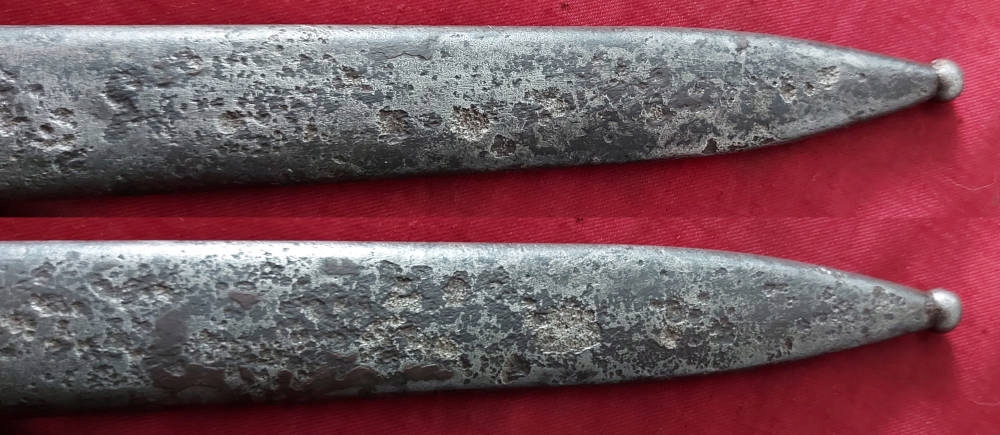 Копію видно на фотографії. Клинок не відшліфований, видно невеликі сліди заточування, але справжнім недоліком є пляма корозії на хрестовині. На поріжку леза клеймо будапештського заводу FGGY. Накладки на ручки дерев'яні, оригінальні. Один в дуже хорошому стані, другий виглядає гірше. Багнетний замок справний. На голові видно маркування 123 Z.