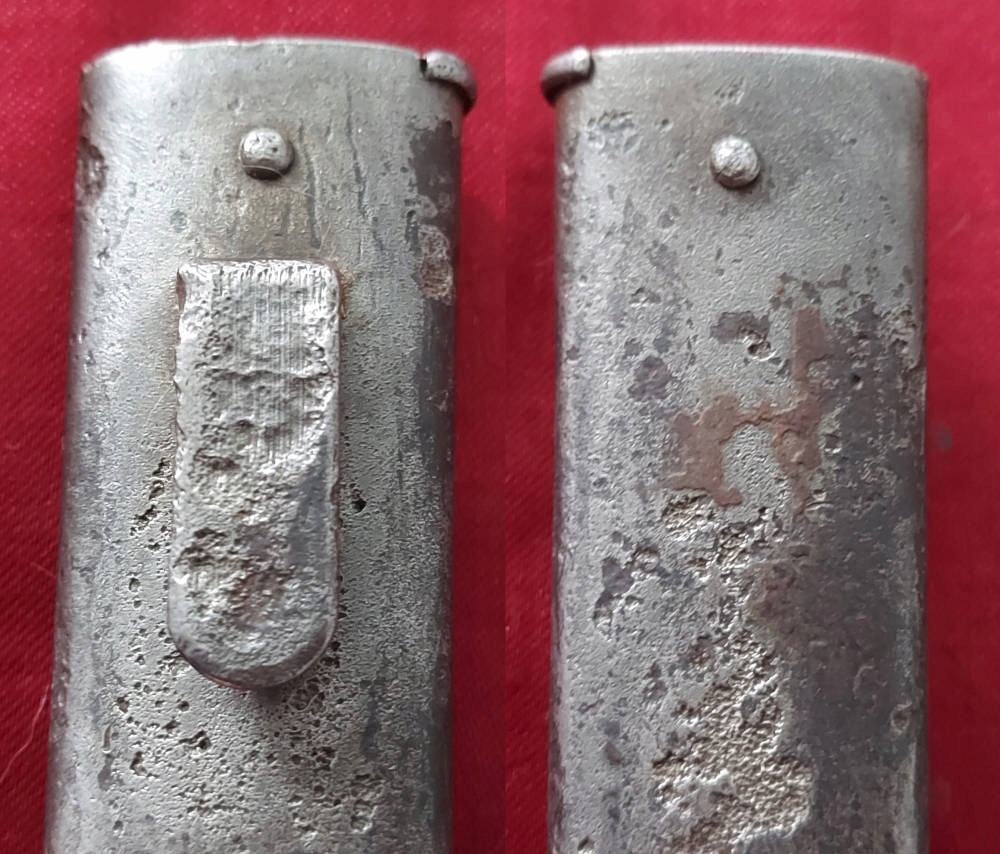На піхвах є корозія, але немає дірок і вони не пом'яті. Листовий метал товстий і все ще міцний. Направляюча піхви функціональна і добре тримає лезо.
