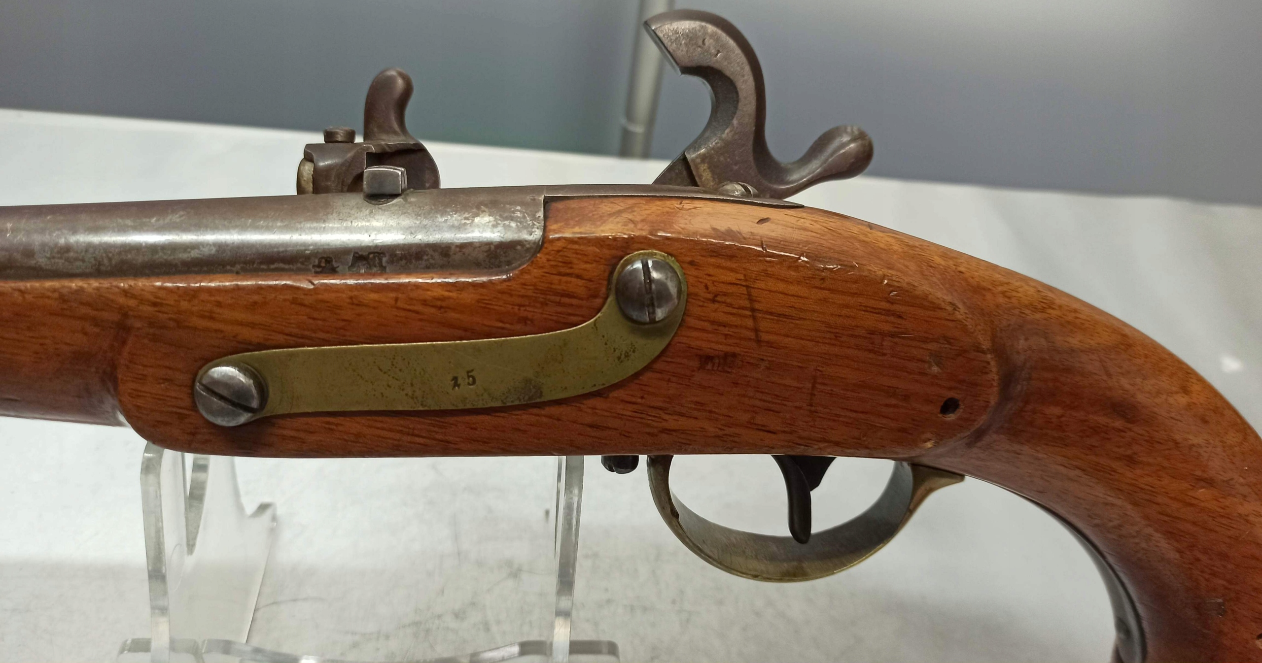 Австрійський піст 19 століття. кіннота М1854 АГУСТИН. Австрія. 1854 р. 100% оригінал. Примірник в ідеальному стані, що не часто буває з військовою зброєю. Речі в хорошому робочому стані, не чистили і не ламали, блискавка працює ідеально. Примірник для користування (дорослими у відведених для цього місцях). Стовбур, замок та інші елементи чисті та не забиті. Ліжко з бука, в дуже хорошому стані. Без пошкоджень та ремонту. Збережена в оригінальному кольорі та поліруванні. Загальна довжина рушниці: 42,3 см, тільки ствола: 25,1 см, кал. 16,9 мм. Закон не підпадає під дію зброї, виготовленої до 1850 року.