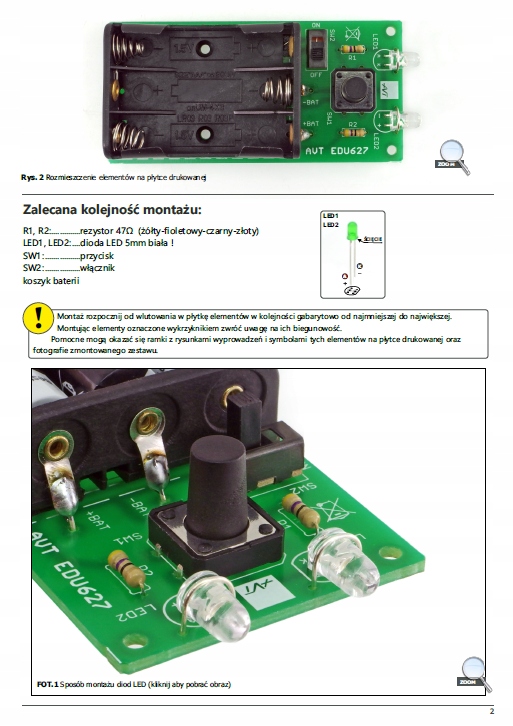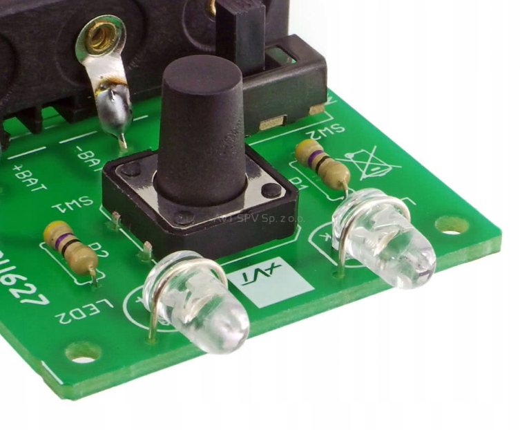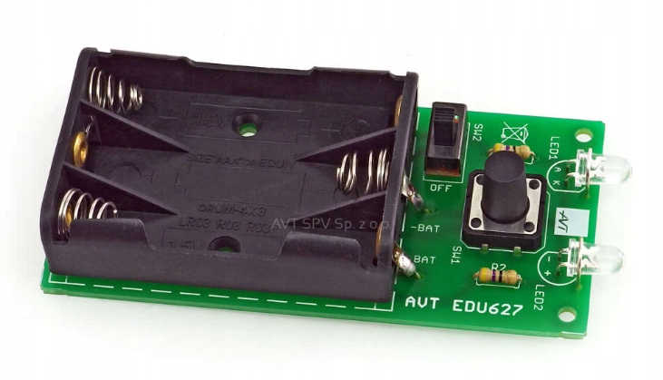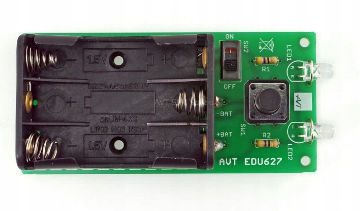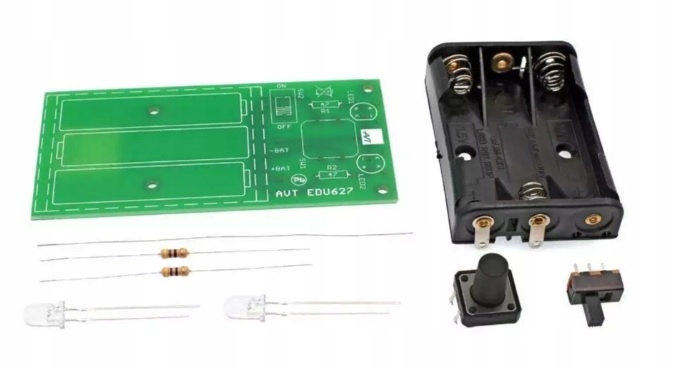 Набір елементів для складання простий ліхтарик з двома світлодіодами. Крім основного функціоналу ліхтарика, набір допоможе в навчанні паяння. Живиться все від 3-х батарейок ААА (R03). За допомогою кнопки і перемикача можна ввімкнути ліхтарик тимчасово або постійно. Друкована плата має розміри 40 x 83 мм, тому вся ця річ невелика і добре лежить у руці.
