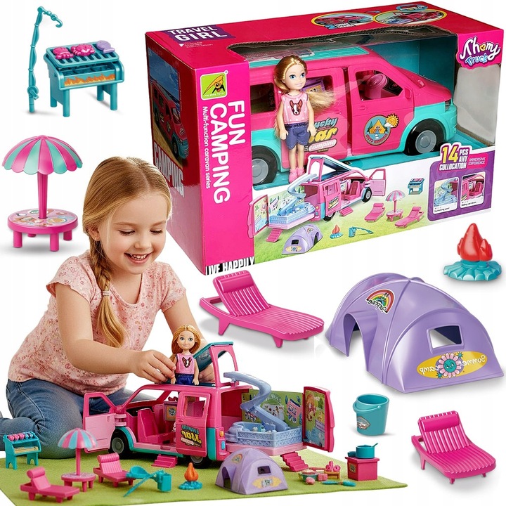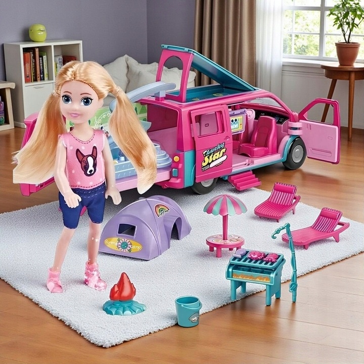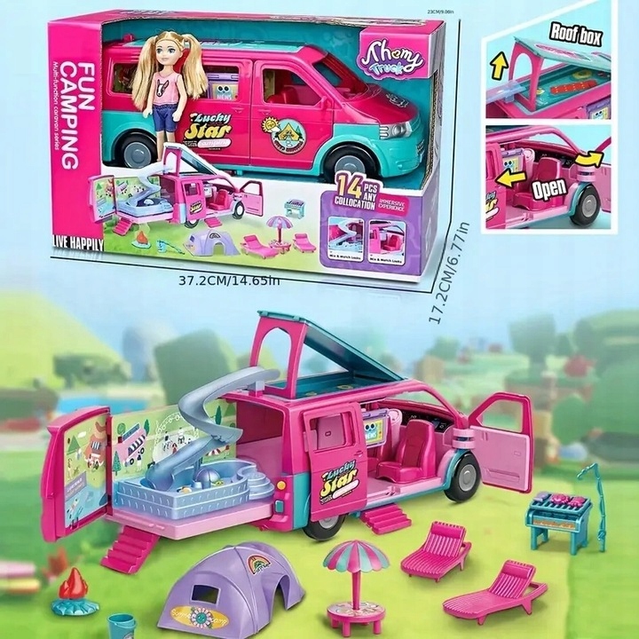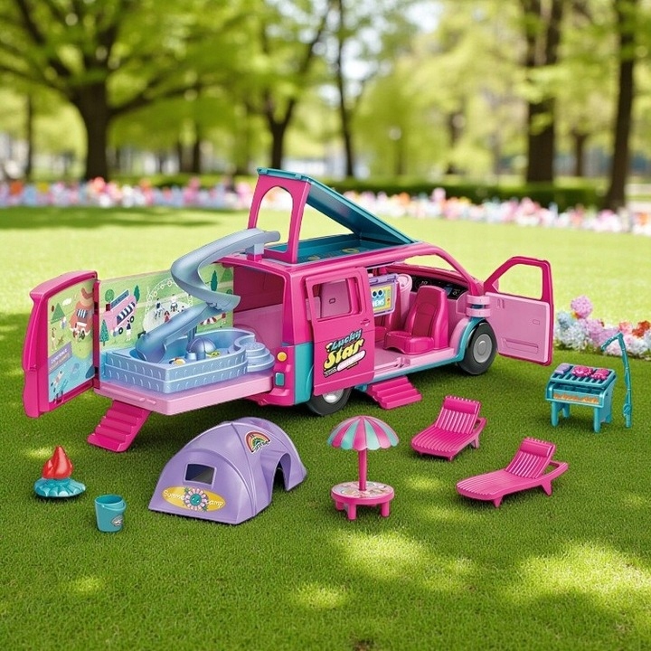 Нехай ваша дитина відкриє для себе радість подорожей і літніх пригод, не виходячи з дому! Цей унікальний розкладний автомобільний кемпер з лялькою та аксесуарами є повною базою для веселого відпочинку - він поєднує в собі функції автомобіля, будинку, басейну та ігрового майданчика. Просто розкладіть транспортний засіб, розгорніть гірку та організуйте міні-кемпінг своєї мрії!