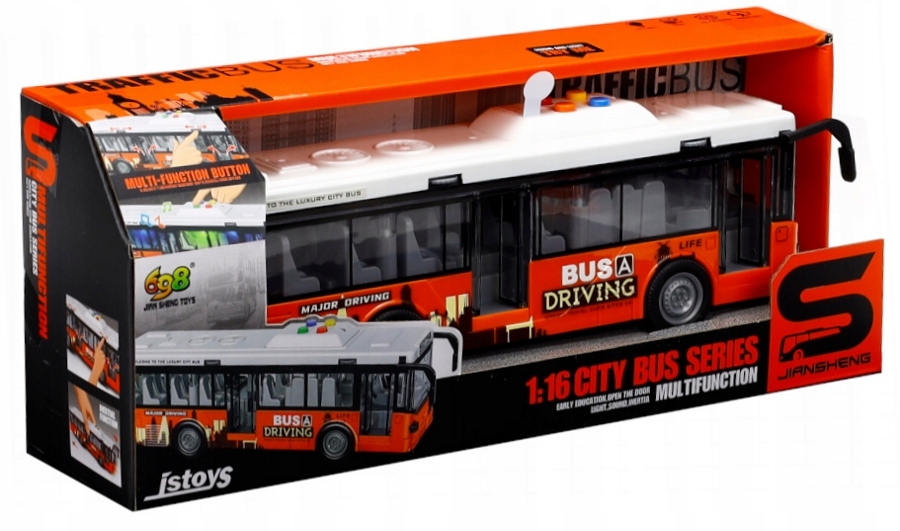 Автобус має двері, що відкриваються з одного боку, а додатковою перевагою іграшки є фрикційний привід (натисніть і відпустіть). На даху є 4 кнопки, які видають звуки, відповідні певному транспортному засобу, і вмикають світло всередині автомобіля.