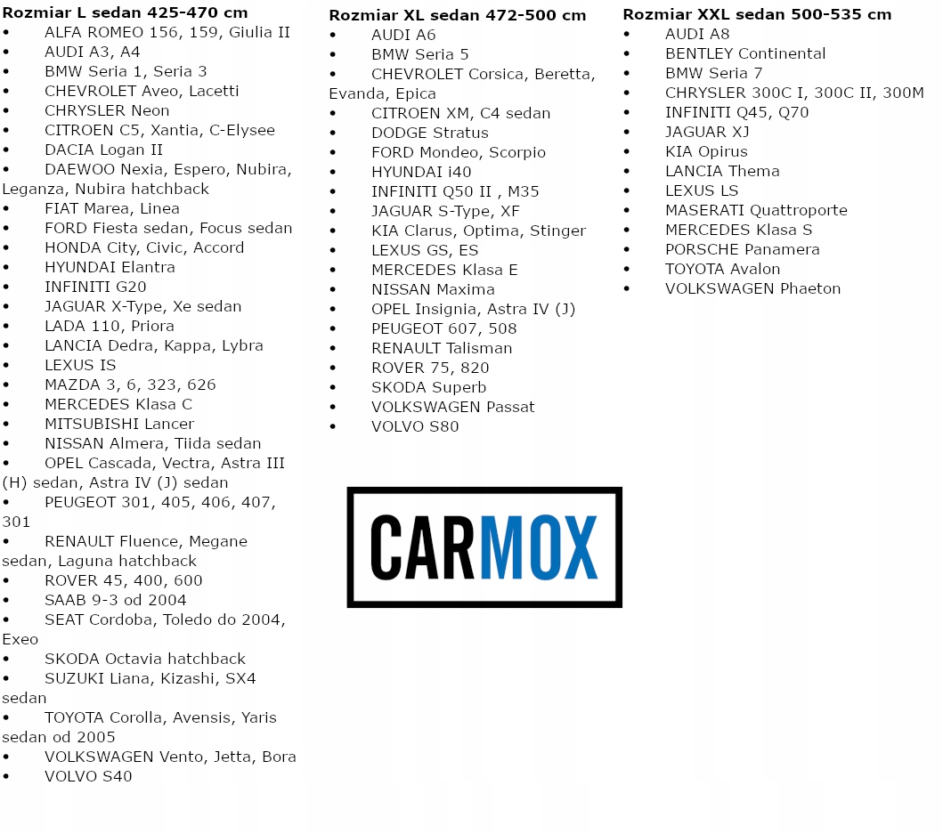 Нижче наведено доступні розміри для версій хетчбек/універсал і седан. Після покупки надішліть нам розмір, який ви хочете надіслати, або марку та модель автомобіля разом із хетчбеком /версія кузова універсал або седан)