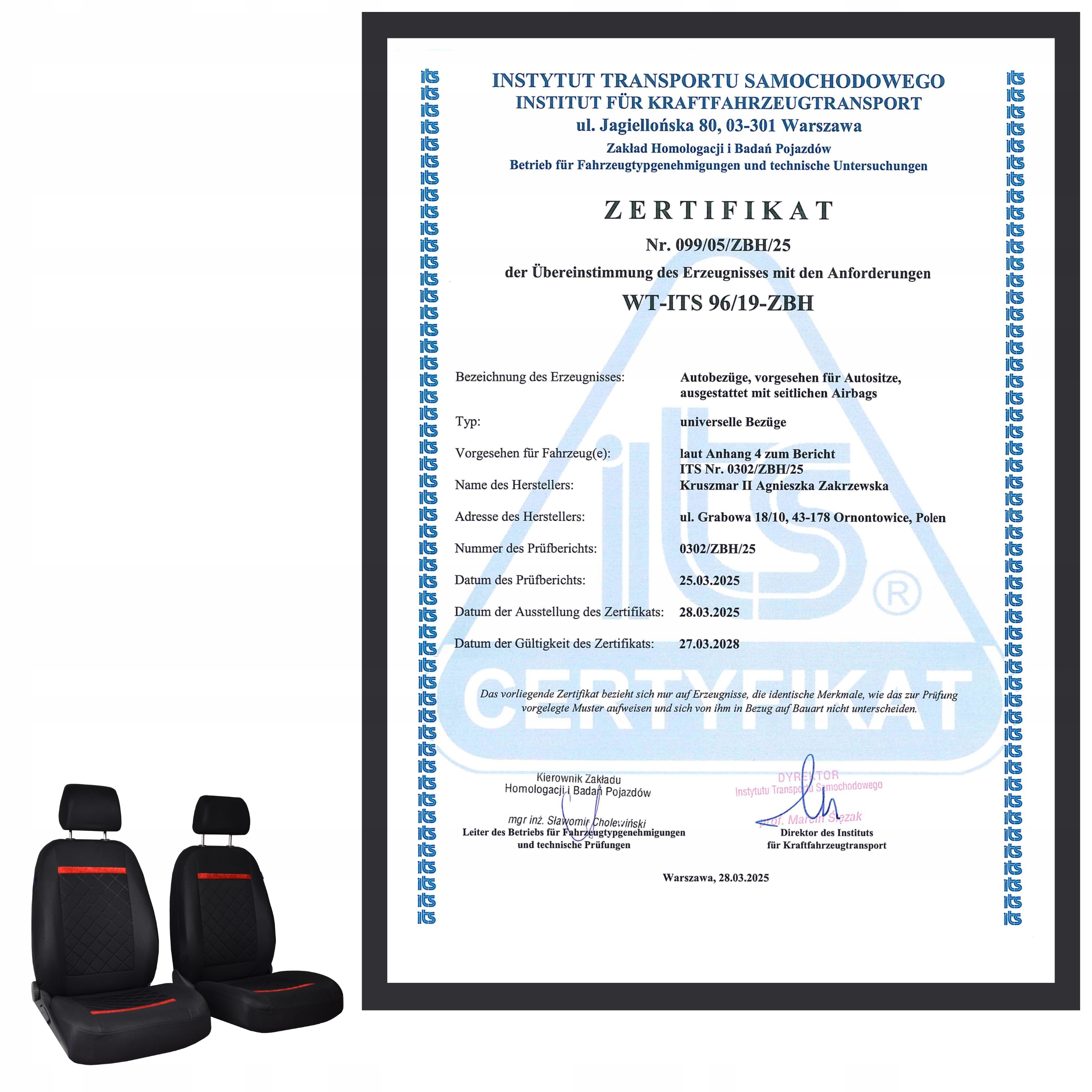 Чохли схвалені ITS (Інститутом автомобільного транспорту), що означає повну сумісність із бічними подушками безпеки. Спеціальна прошивка забезпечує їх правильну роботу - безпека водія і пасажира повністю збережена.