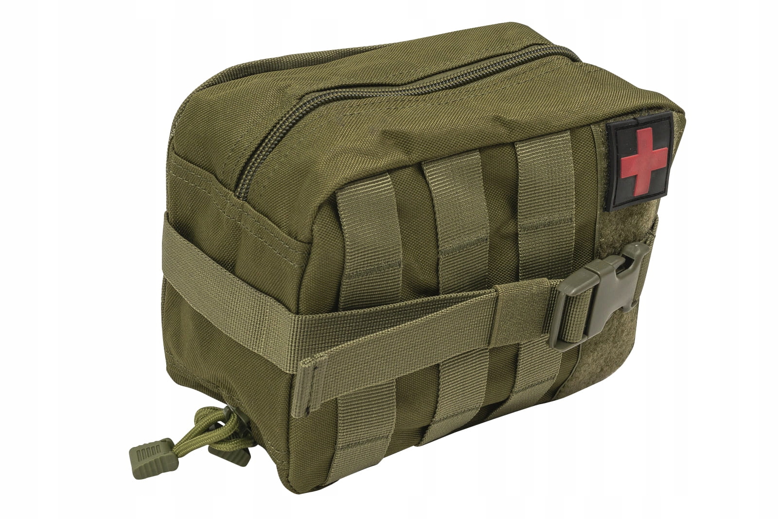 Виріб виготовлено з міцного матеріалу (поліестер 600D), стійкого до погодних умов. Аптечка закривається на блискавку. Значок червоного хреста кріпиться за допомогою липучок і легко знімається.