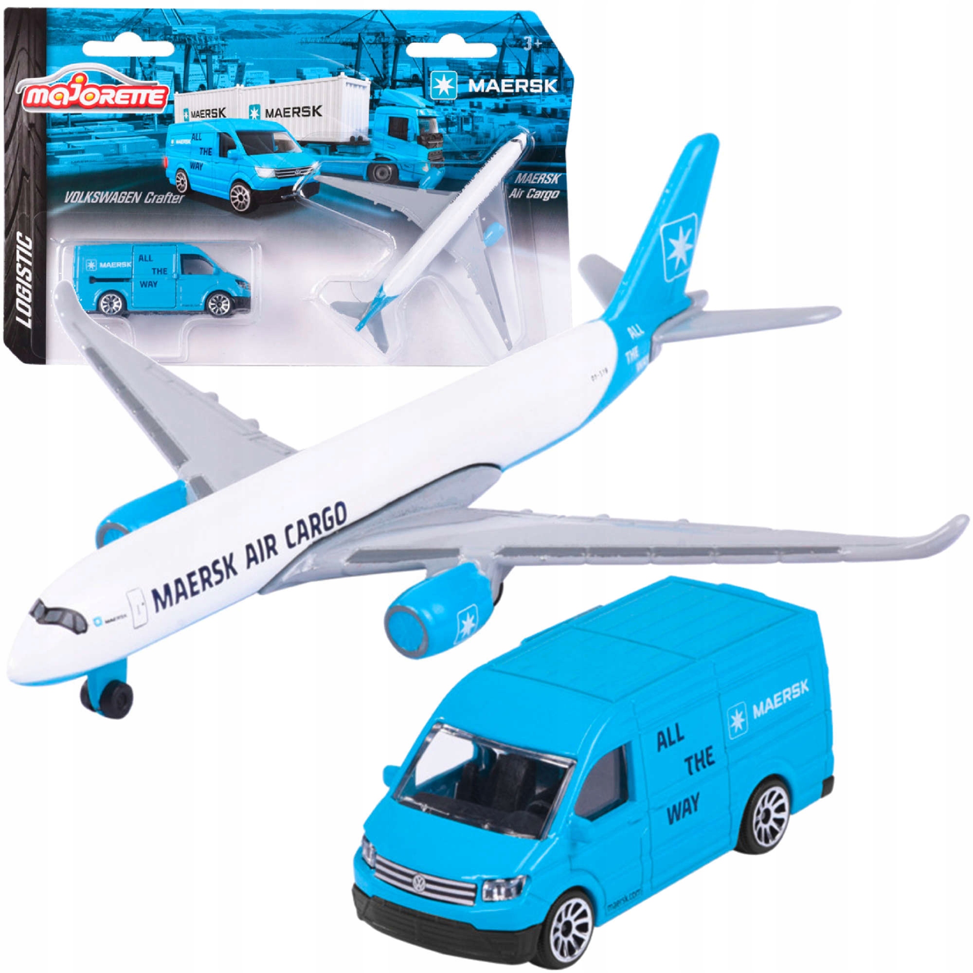 Автобус синій, а літак білий із логотипом Maersk, одного з найбільших контейнерних операторів. Іграшка виготовлена з металу та частково з пластику. Має рухомі колеса, завдяки яким може пересуватися по рівних поверхнях. Він зроблений дуже акуратно і точно відображає справжній автомобіль.