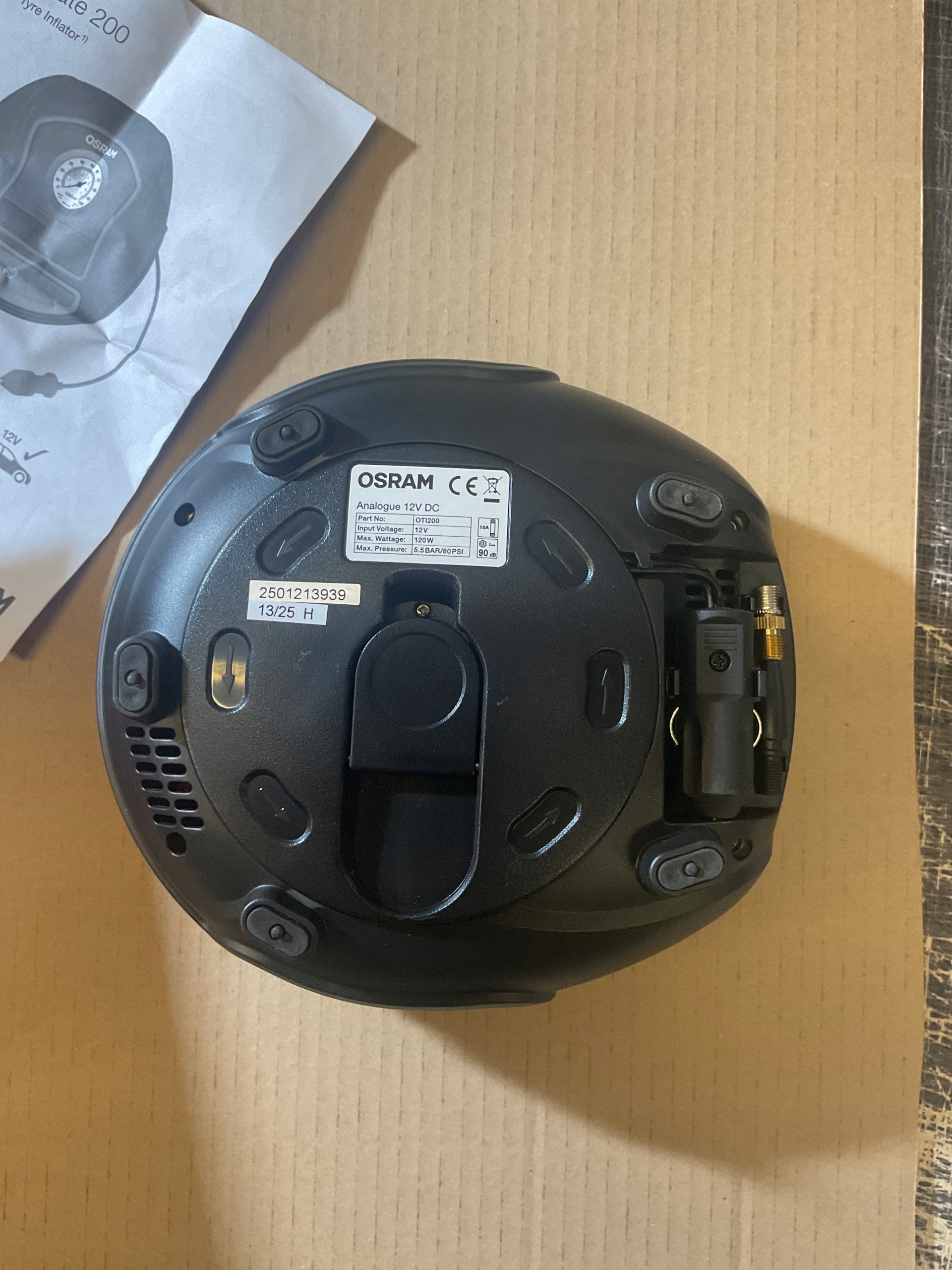 OSRAM Tyreinflate 200 — це аналоговий компресор, який накачає 13-дюймову шину за 4,5 хвилини**. Він має велику кнопку ввімкнення/вимкнення для легкого використання.