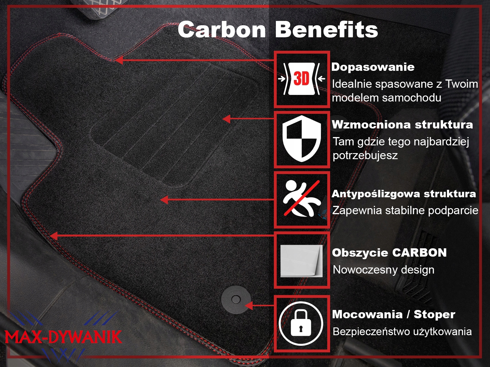 Завдяки використаннюкарбонової стрічки килими MAX-DYWANIK стають не тільки естетичними, але й надзвичайно функціональними. Ця інноваційна технологія забезпечує їм виняткову стійкість до стирання та стійкість до пошкоджень. Крім того, карбонова стрічка надає килимкам елегантний і сучасний вигляд, який ідеально підходить до різних стилів салону автомобіля.