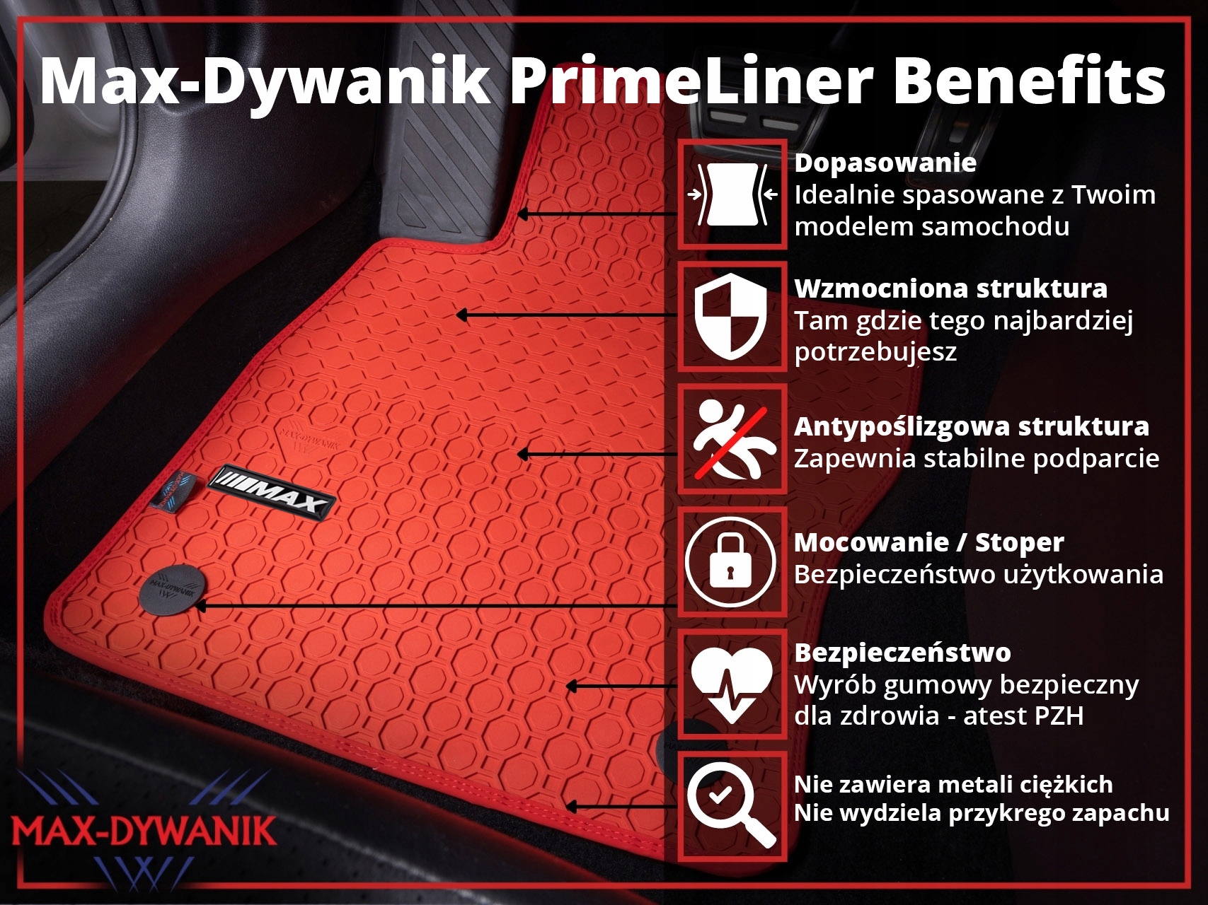 Prime-Liner від відомої компанії MAX-DYWANIK - відмінне рішення, яке забезпечує захист вашої підлоги на найвищому рівні. Виняткова якість та інноваційні рішення роблять ці килими неперевершеними у своїй категорії. На килимках є гелеві емблеми, розроблені MAX-DYWANIK, які підкреслюють зовнішній вигляд килимків.