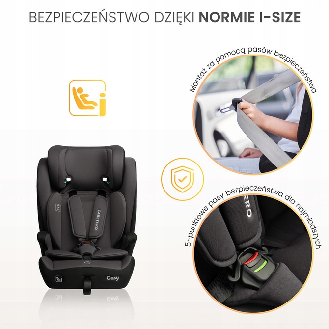 Затишна модель відповідає вимогам стандарту розміру R129/I, забезпечуючи найвищий рівень безпеки. Завдяки установці з ременами автомобілів, сидіння може бути оптимально пристосоване до різних транспортних засобів. Крім того, автокрісло має спеціальні 5-бальні ремені, які забезпечують стабільність та безпеку для дітей в межах 76-87 см.
