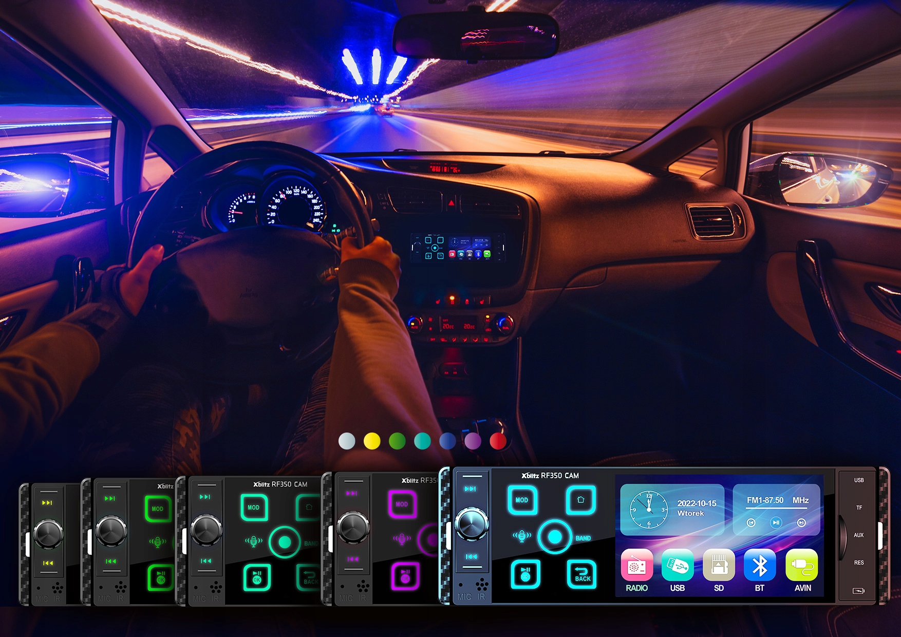 Завдяки семи різним кольорам підсвічування ви можете підібрати колір радіо до салону кабіни вашого автомобіля. Ви можете вибрати з таких кольорів: білий, фіолетовий, синій, жовтий, червоний, синій і зелений.
