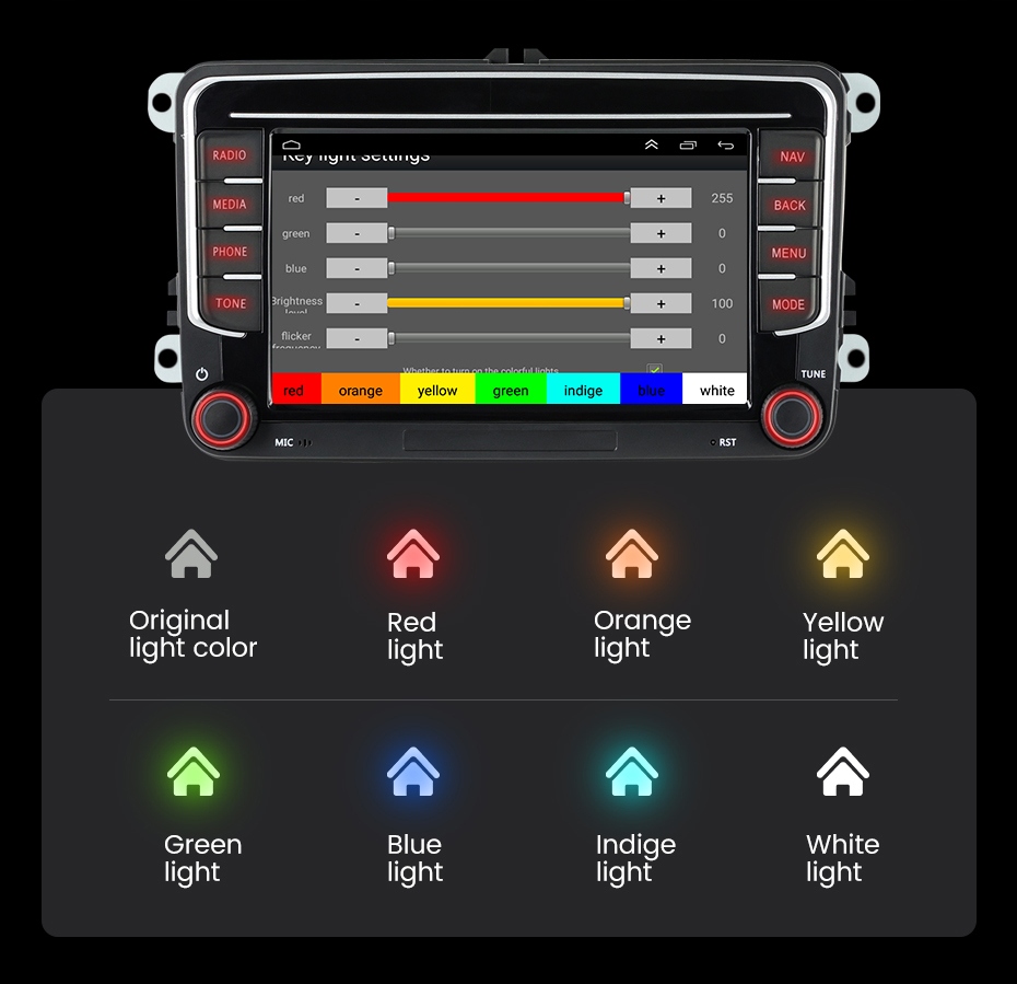 Радіо має колірну палітру RGB, тому ви можете вибрати будь-який колір радіо, що дозволить вам відповідати зовнішньому вигляду салон автомобіля!