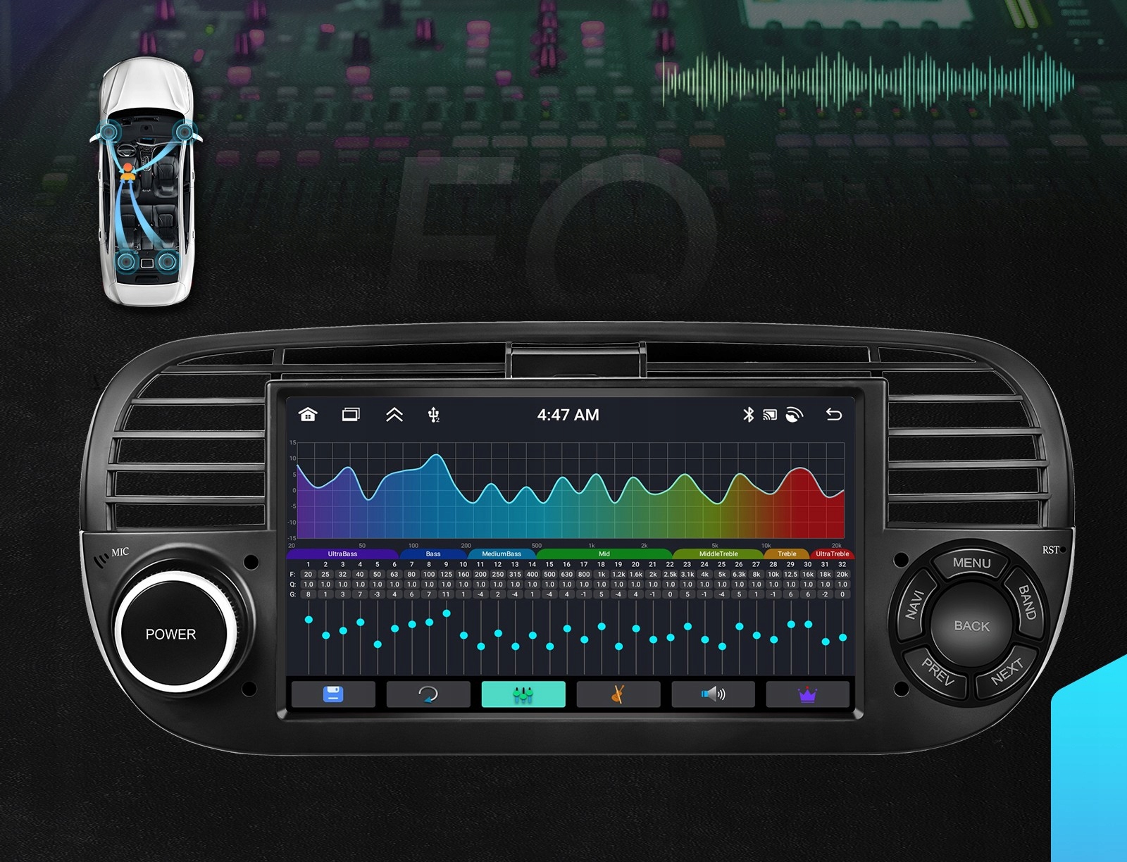 - Інтуїтивно зрозумілі налаштування звуку: баланс (лівий канал, правий канал) і фейдер (спереду та ззаду).