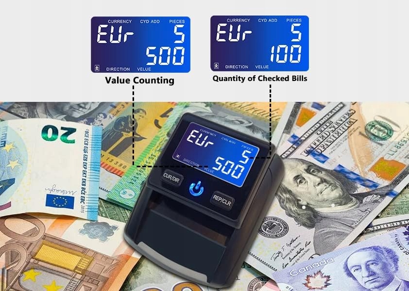 Детектор підробок 2 в 1: це також лічильник паперової валюти, який підраховує номінали та кількість євро, доларів (включаючи нові банкноти). Детектор валют може виявляти назви валют. Великий світлодіодний екран може чітко відображати валюту, загальну кількість і загальну суму.