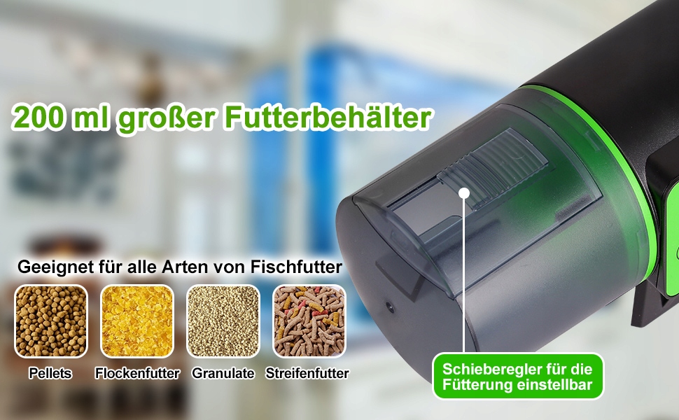 【Велика ємність 200 мл】: автоматична годівниця для акваріума великої ємності 200 мл, підходить для різні корми для риб, такі як пластівці, гранули, порошок і смужки. Відрегулюйте повзунок, щоб контролювати кількість корму для риб.