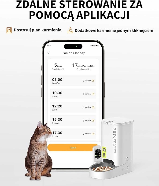 Диспензатор оснащений камерою 1080p з широким кутом зору 140 °, який автоматично переходить у режим нічного зору. Це дозволяє стежити за домашнім улюбленцем у прямому ефірі, навіть коли ви знаходитесь поза домом. Ви можете встановити години камери в додатку або повністю відключити її, щоб захистити свою конфіденційність. Wi -Fi 2.4G), де ви можете регулювати години годування, стежити за історією подачі їжі та, якщо потрібно, додати їжу вручну. Можливість планувати до 5 прийомів їжі на день. Ємності 3 літрів (1,33 кг сухої їжі) достатньо близько 15 днів для дорослого кішки.
