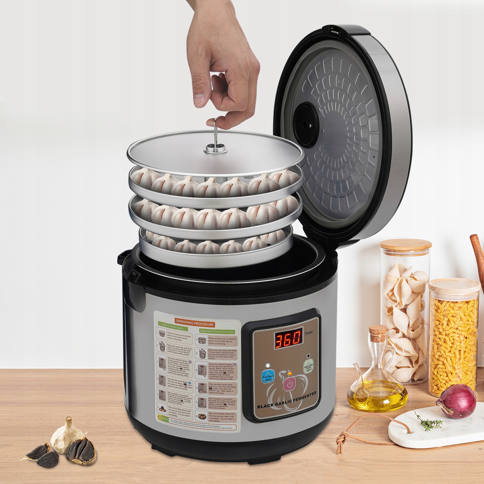 - Постійна якість бродіння: потовщена алюмінієва нагрівальна пластина, круговий обігрів на 360° та решітка для часнику у формі полиці забезпечують рівномірний розподіл тепла для досягнення оптимальних результатів. Настроювані цикли бродіння – 12 днів для кількох зубчиків, 15 для часнику окремо – щоразу отримують точний чорний часник професійного рівня.