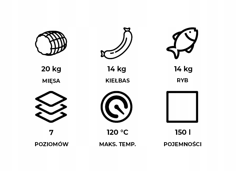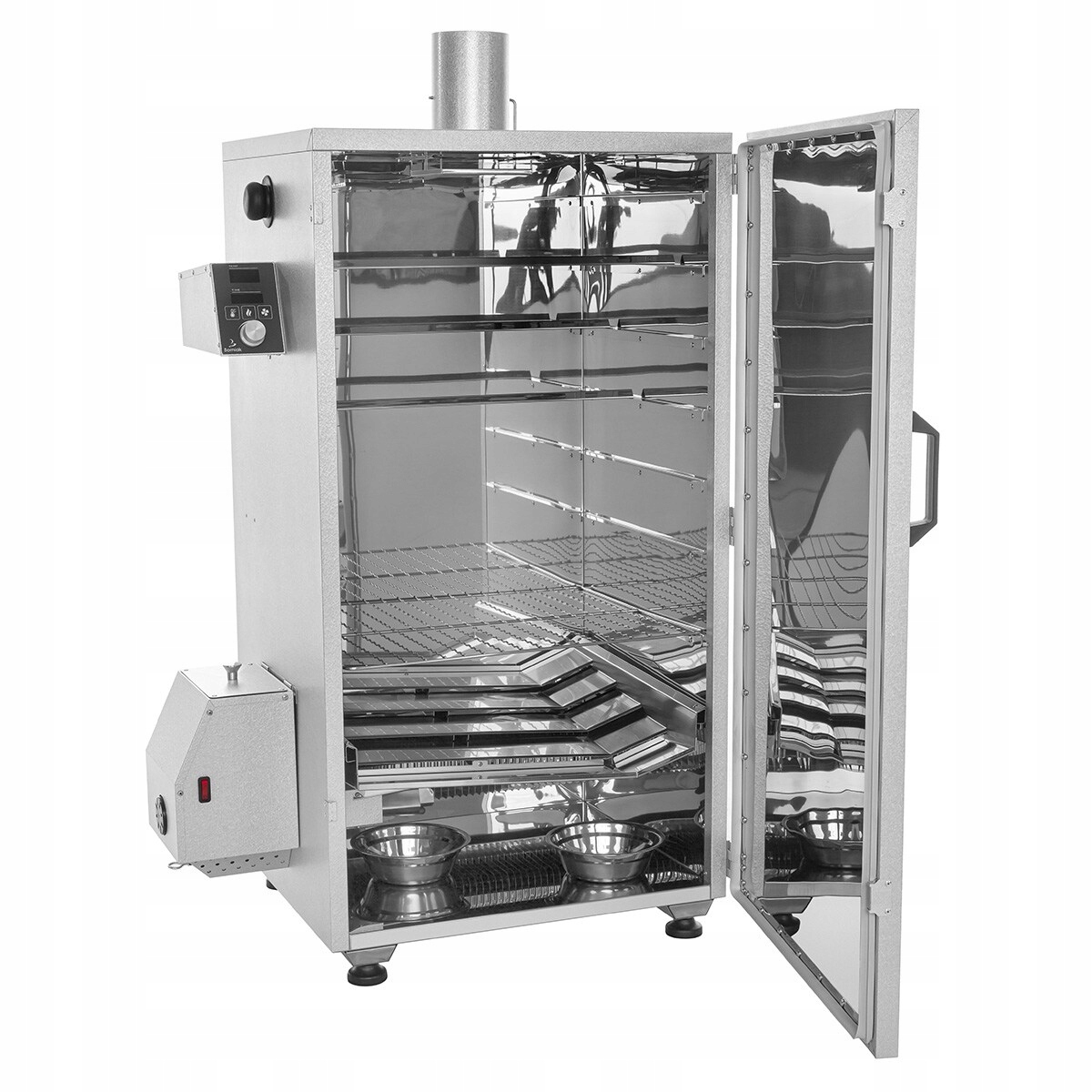 Зручна у використанні, велика коптильня об'ємом 150 літрів з електронною панеллю управління та можливістюкоптіння як гарячого так і холодного. У моделі використовується обігрівач з радіатором, завдяки чому розподіл температури відбувається дуже ефективно. Простора коптильна камера дозволяє коптити до 20 кг м'яса на 7 рівнях.
