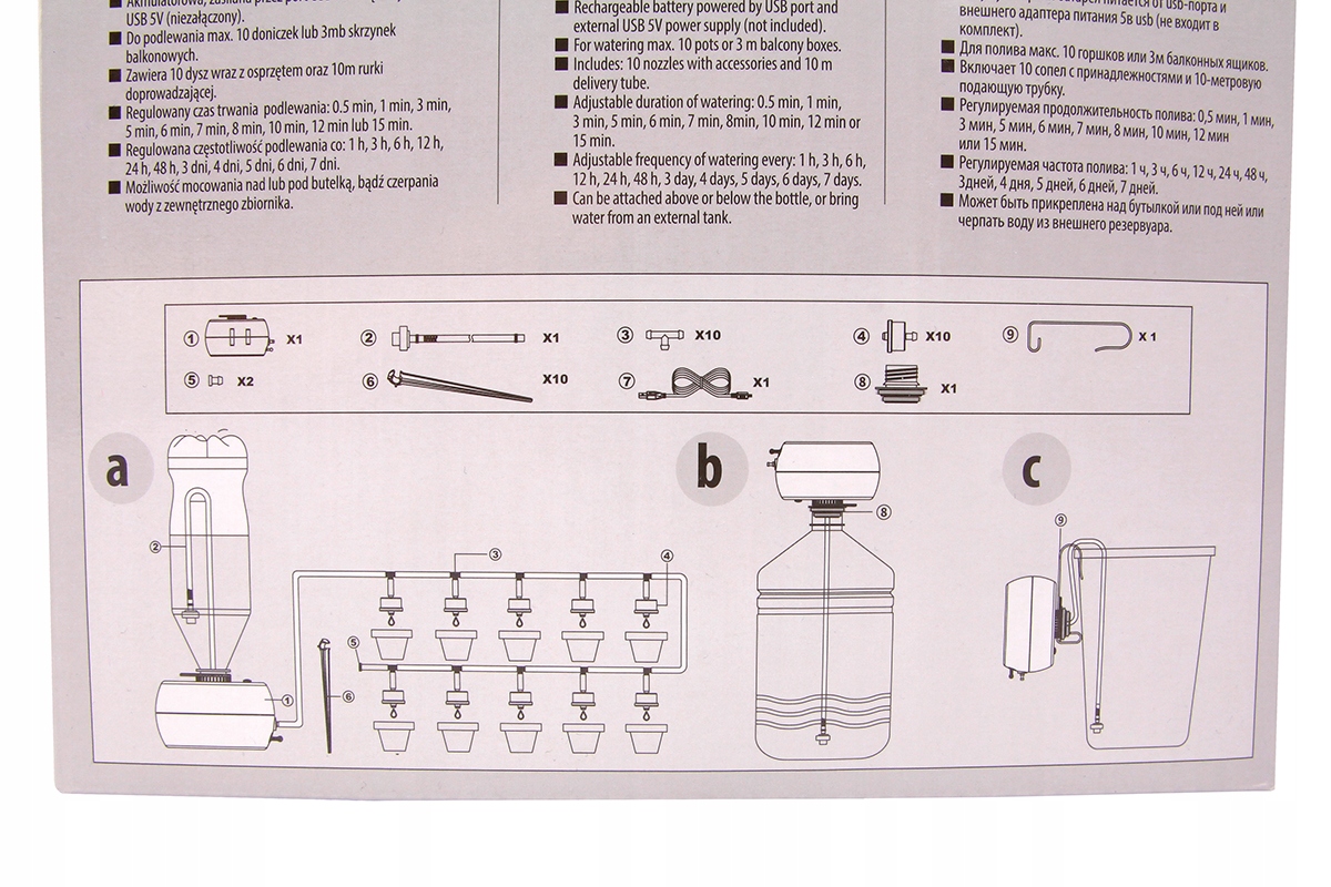 Заряджена лійка автоматично викачує воду з пляшки або резервуара та доставляє її до рослин у горщиках у вибраний час (максимум для 12 рослин або 3 погонних метрів балконних ящиків).