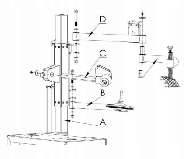 Прикрутіть корпус кронштейна до корпусу шиномонтажного пристрою в горизонтальній площині за допомогою гвинтів F (M10x35 мм), використовуючи пружинні шайби E і плоскі шайби D. Не затягуйте гвинти повністю, залиште простір між корпусами прикручуваних елементів.