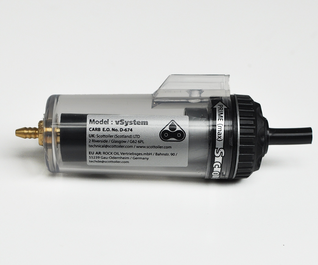 Автоматична маслянка Scottoiler. V-System — це система змащування ланцюга, яка керується вакуумом, створюваним працюючим двигуном.