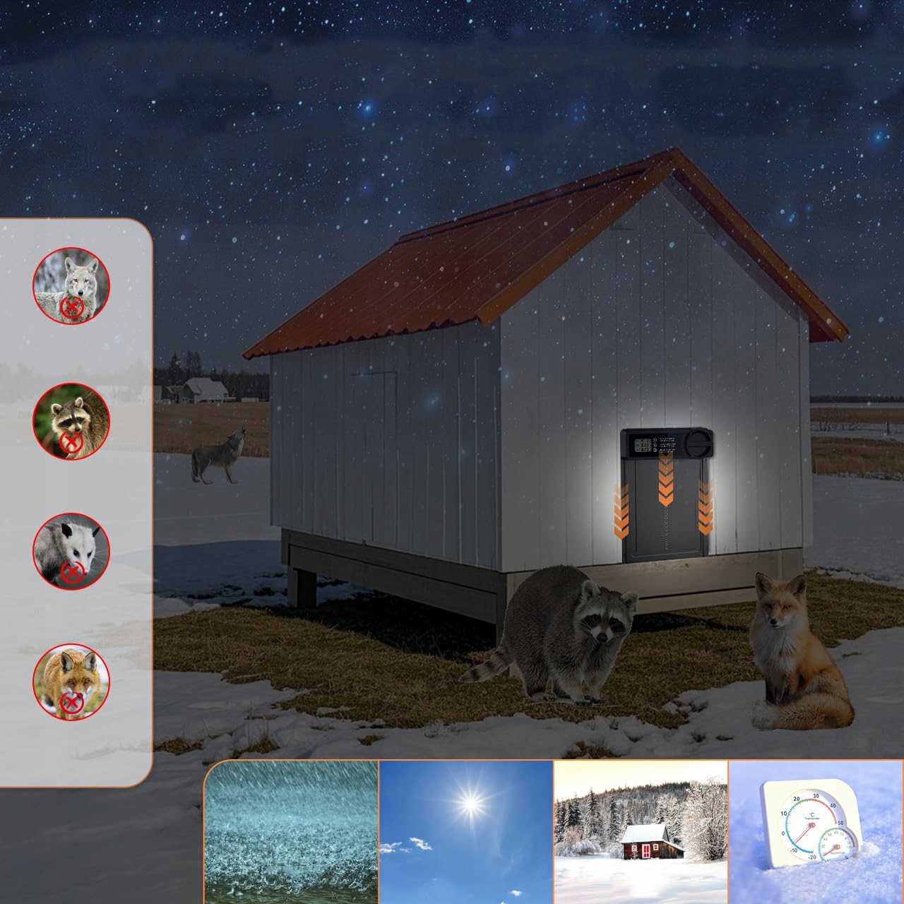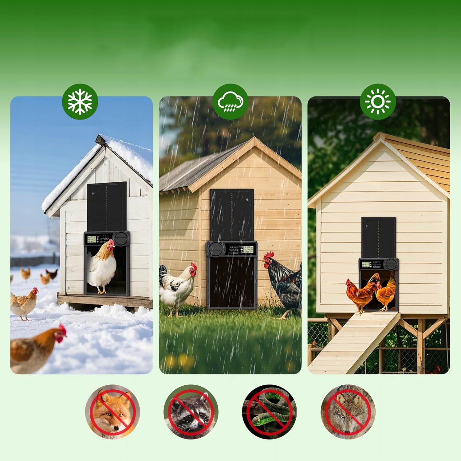 🐔 Конструкція проти защемлення - Якщо двері з алюмінієвого сплаву виявляють перешкоду під час закривання, двері автоматично відчиняються приблизно на 3 см і зупиняються на 10 секунд перед зачиненням. Після усунення перешкоди дверцята повністю зачиняться, щоб уникнути травмування птиці.